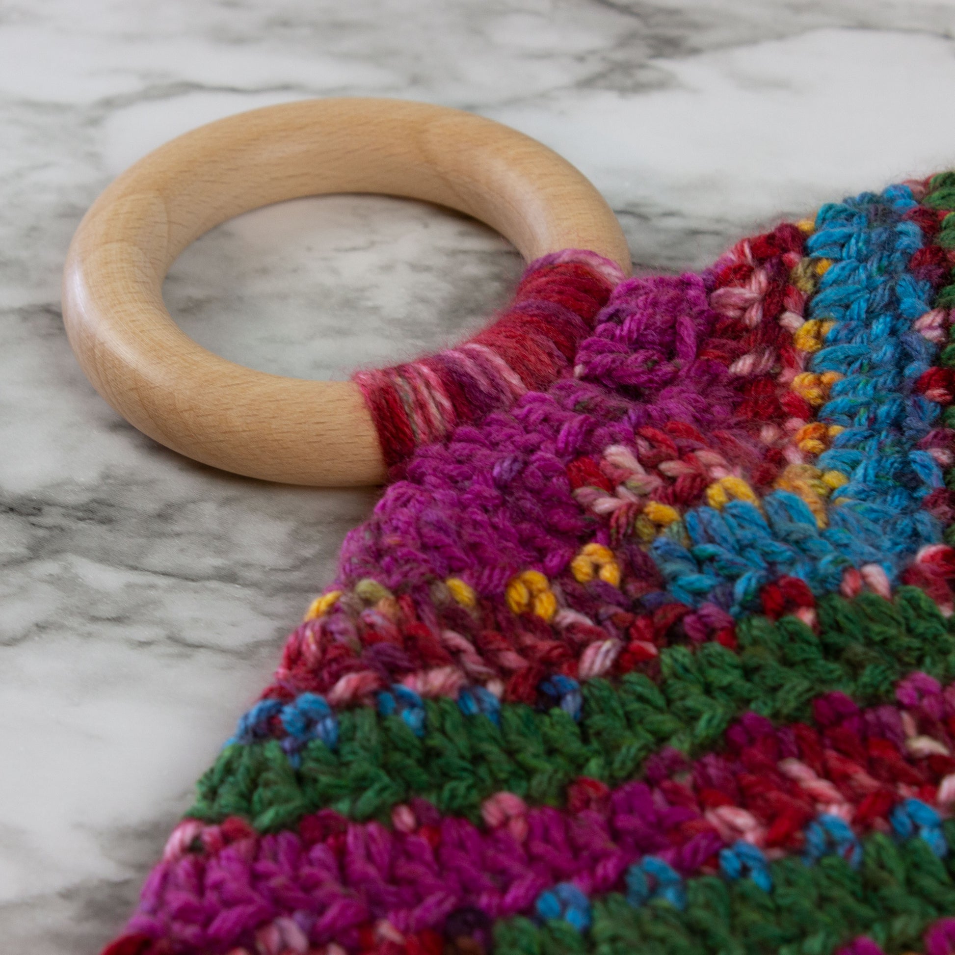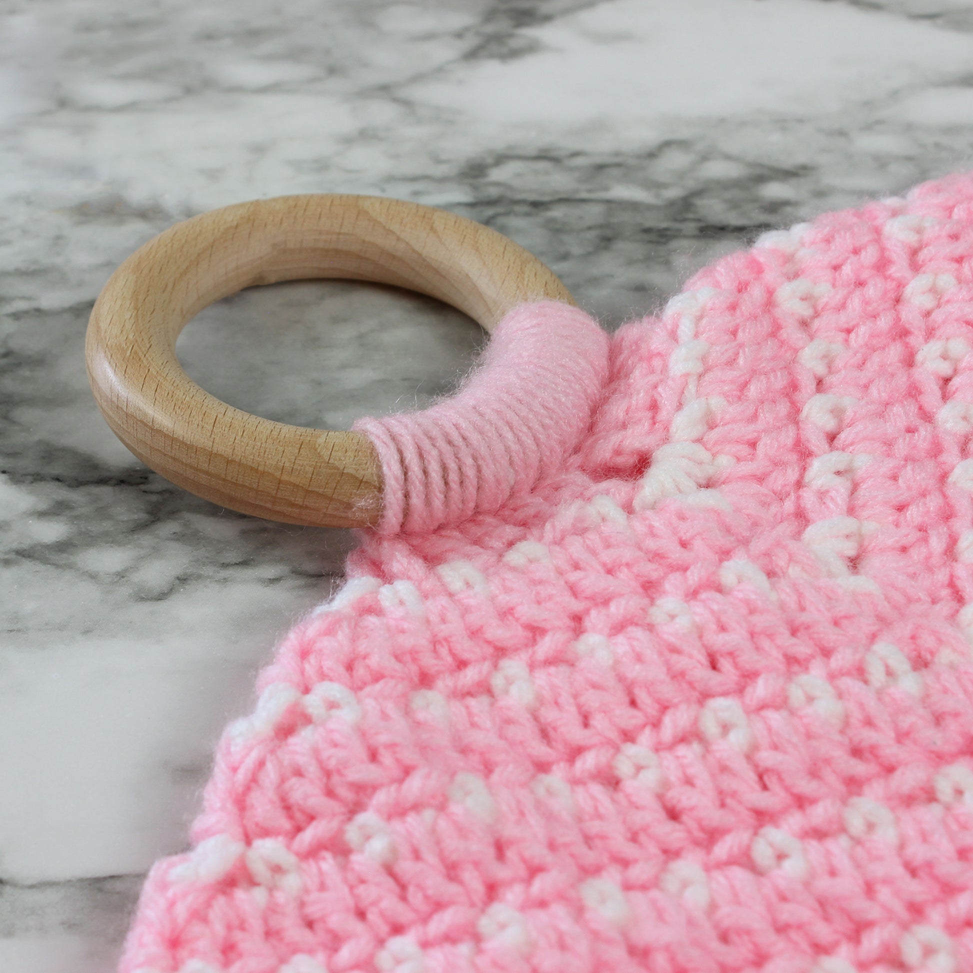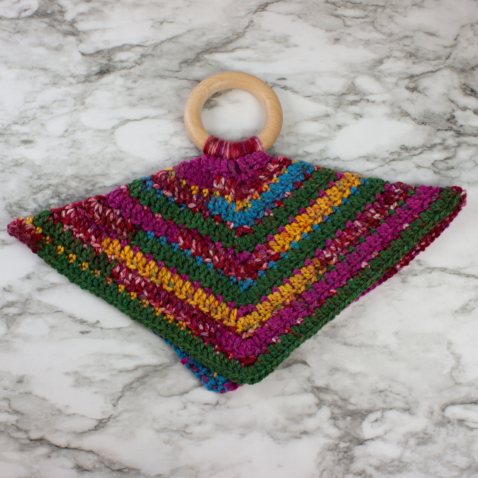 Offer your baby much needed relief and a cuddly toy all in one. This teething ring love opens to 13 inches long in the blanket so your little one has plenty to hold. The smooth wooden ring is the perfect relief for aching gums. Our multicolored design is eye-catching for your little one. Keep your baby happy during all parts of the day.