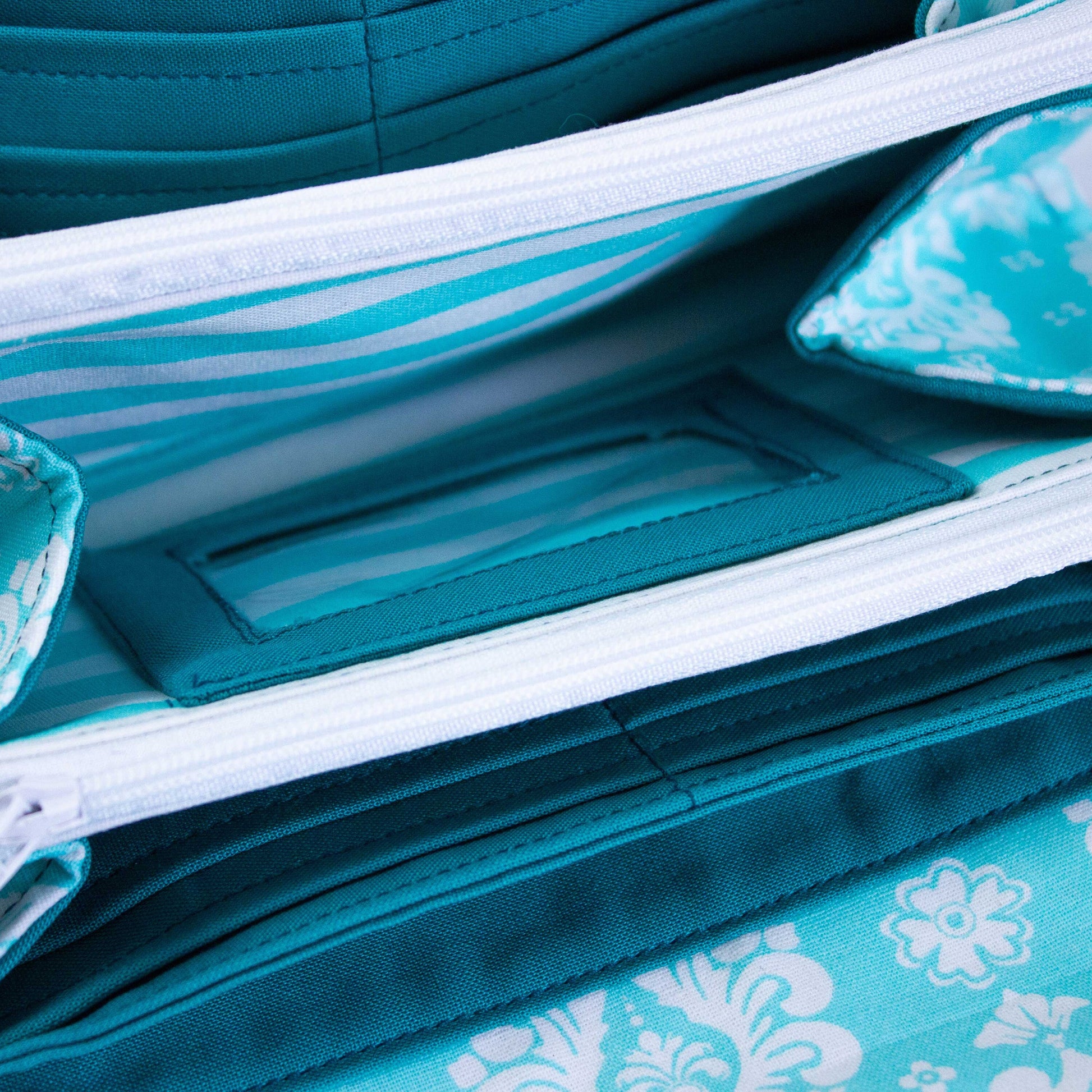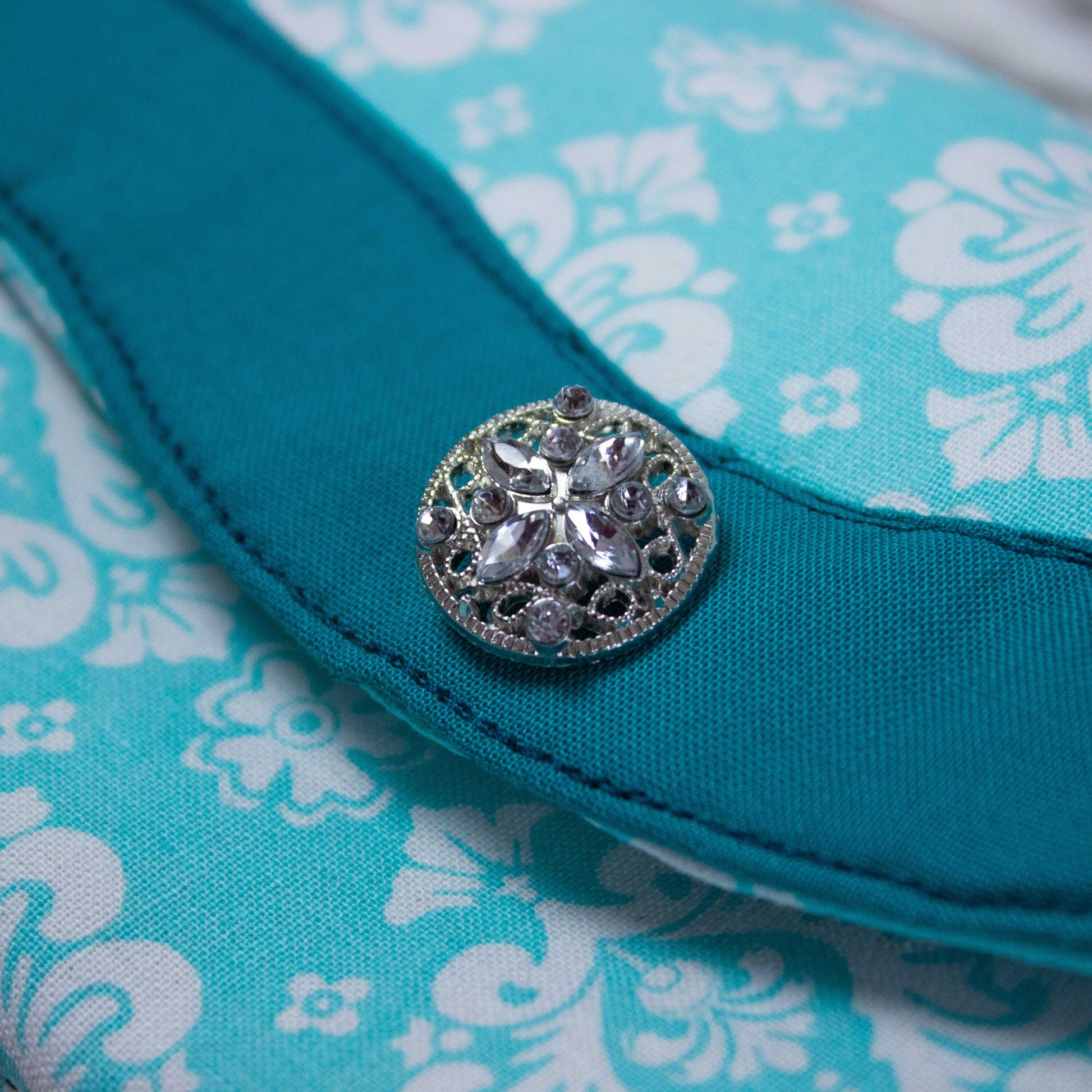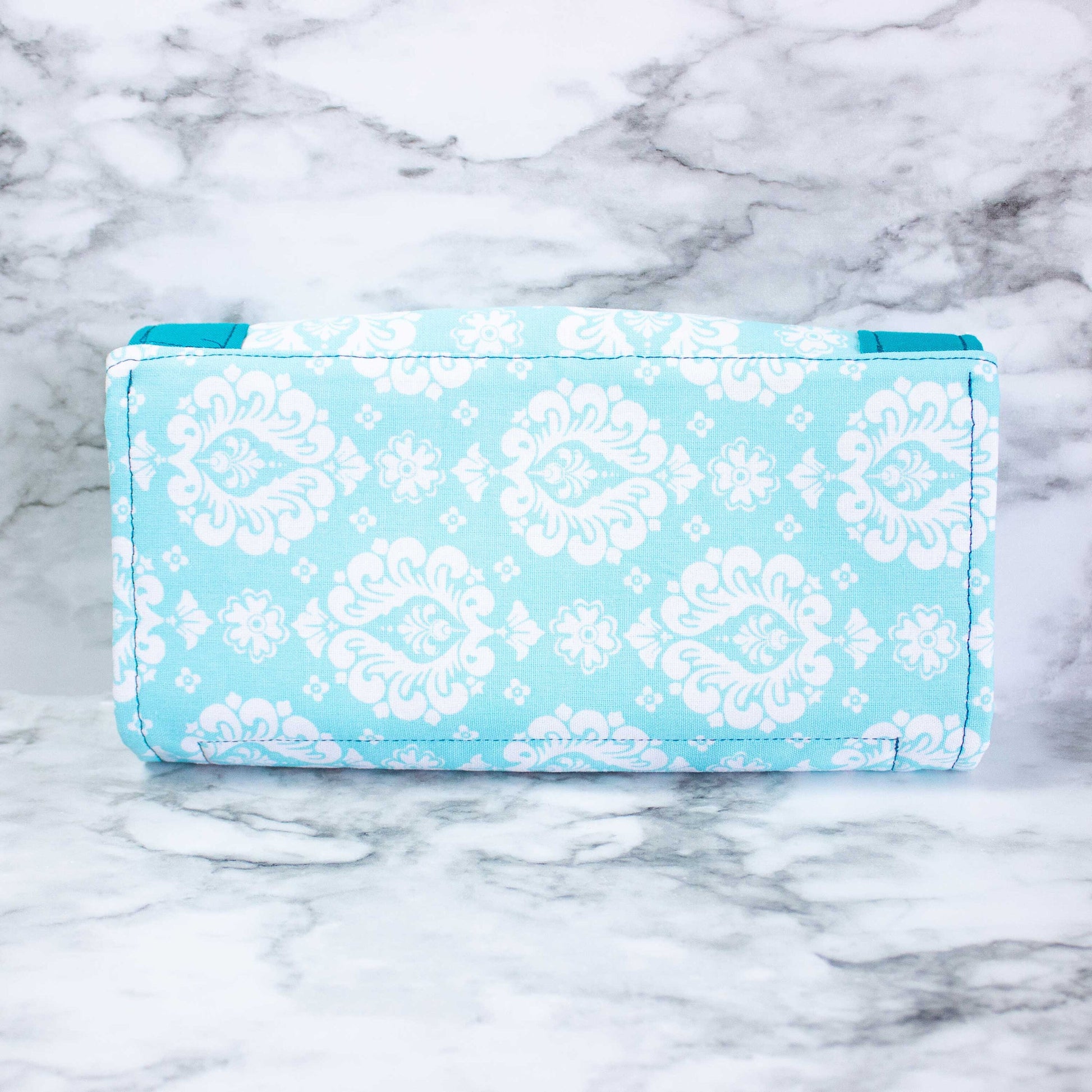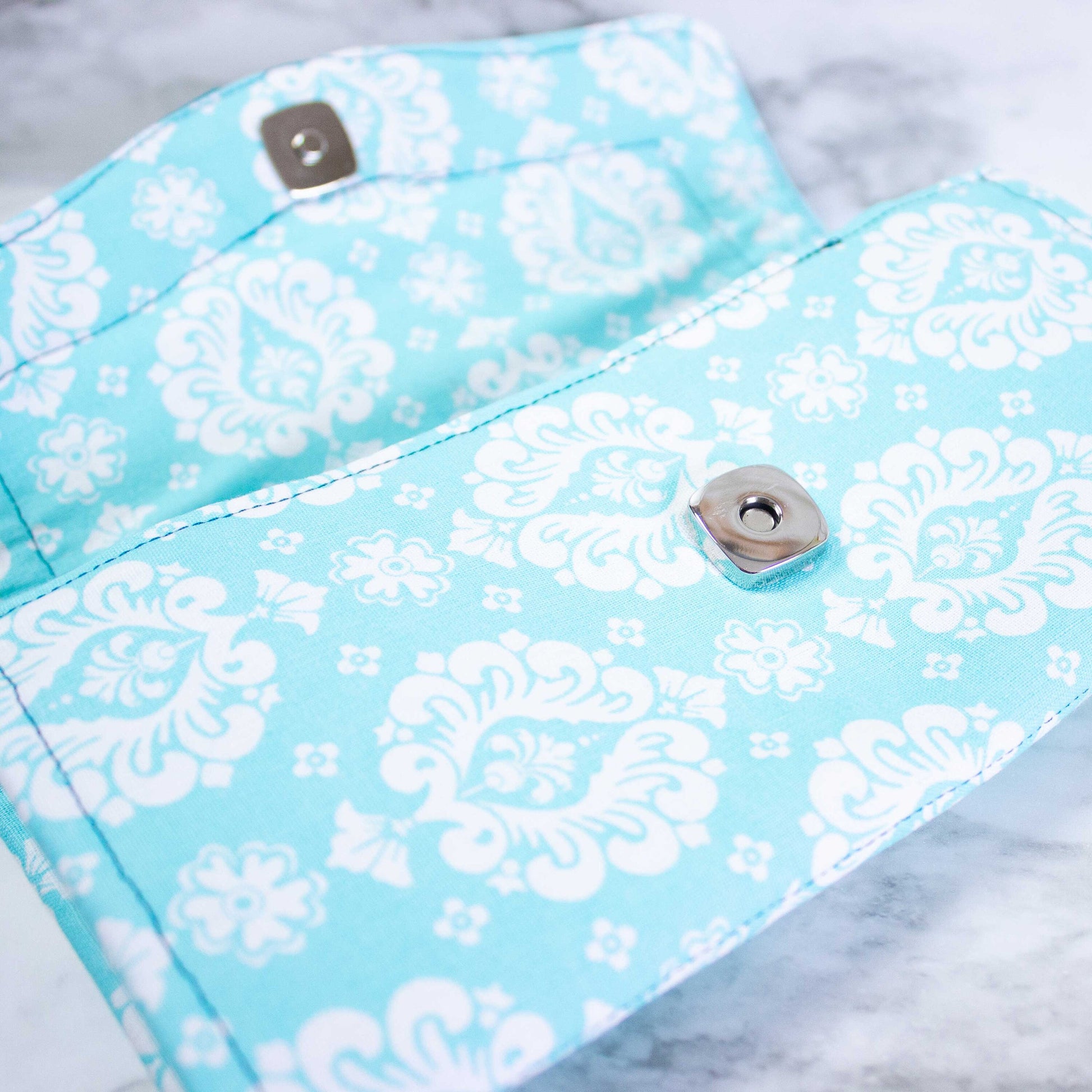 The NCW is the perfect clutch wallet to fit everything you need. Large enough to fit your phone, money, cards, and more. This wallet features a blue demask fabric, accented with teal borders.