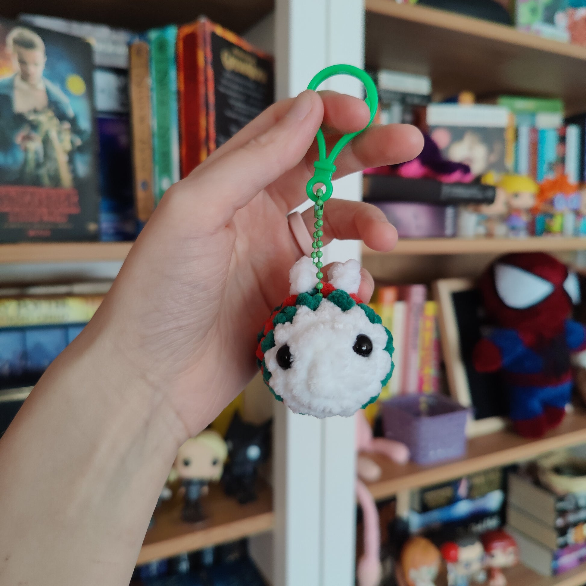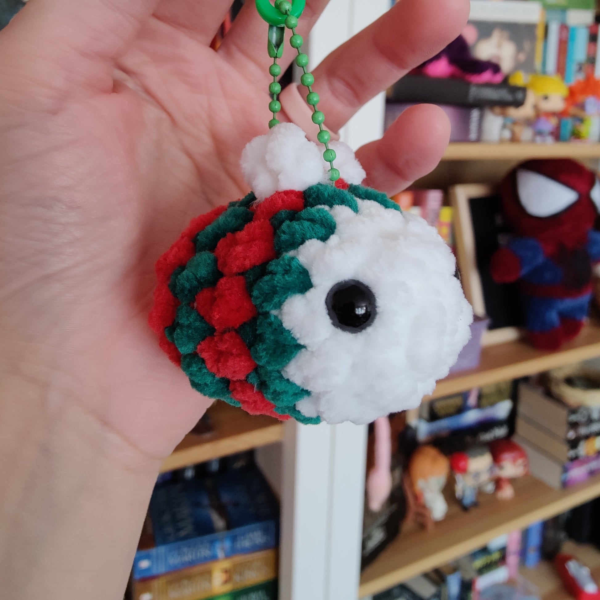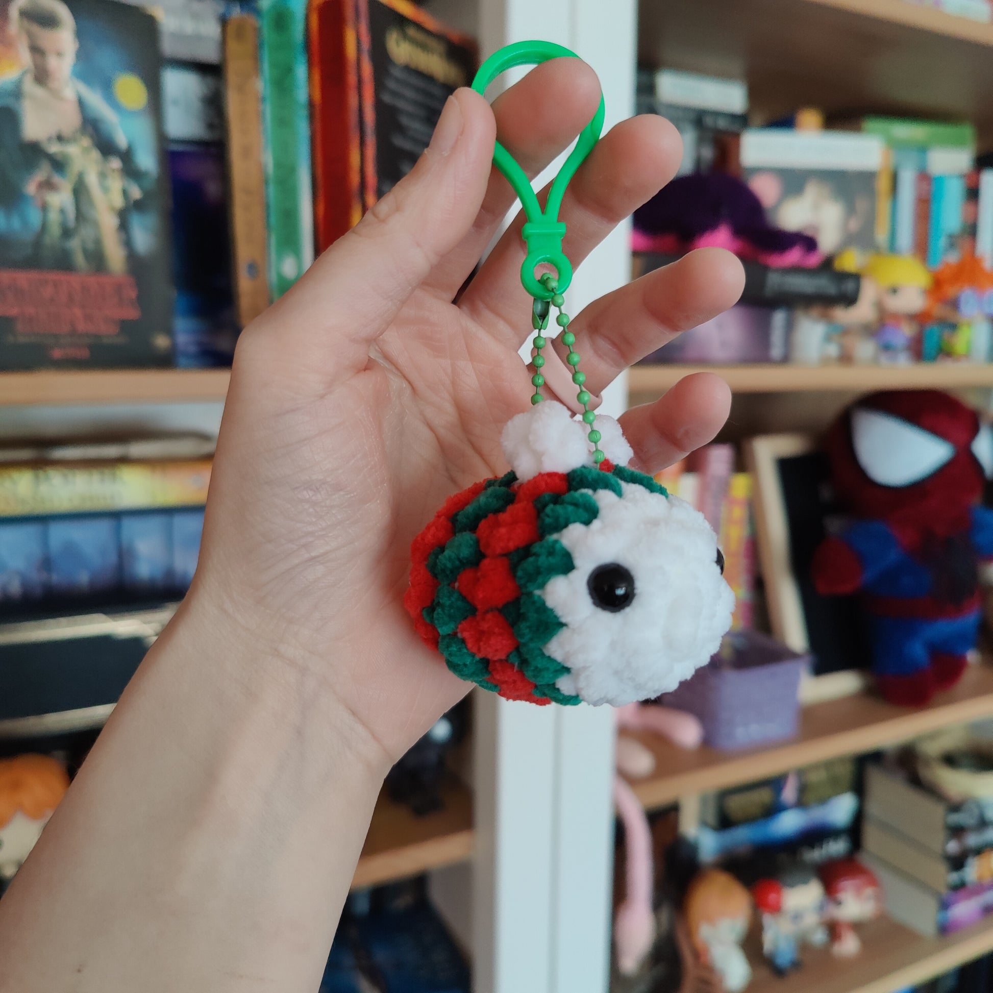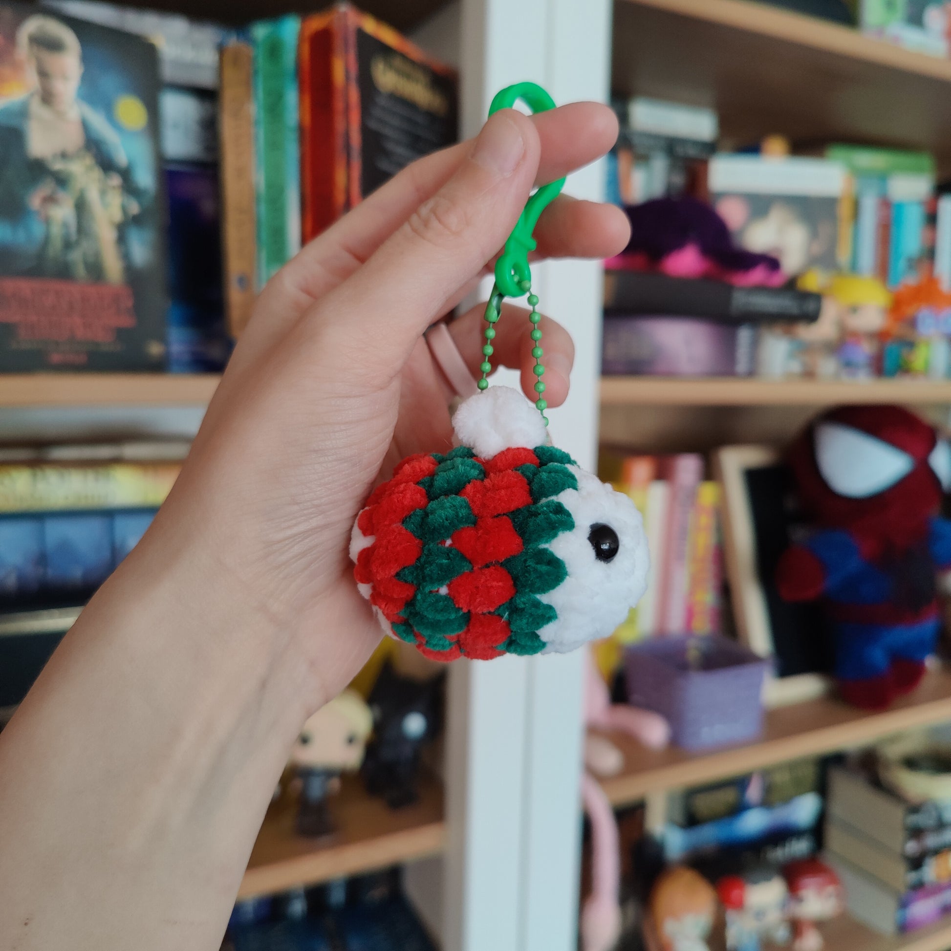 Carry some cute Christmas bees around with you this holiday season. This little bee plushie keychain is super festive with red and green stripes. Features a plastic clasp to hook on your bags, keys, and more.