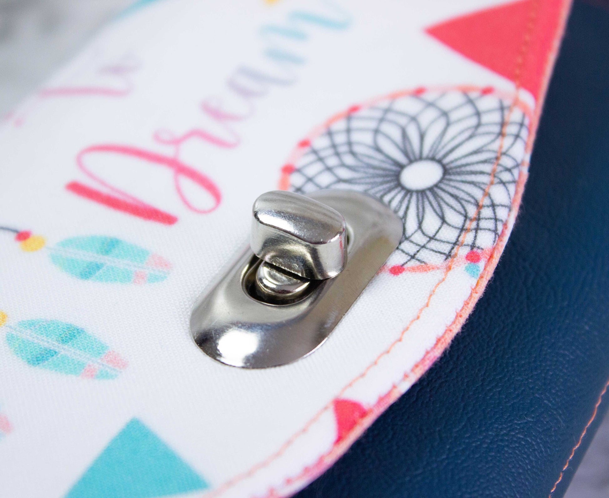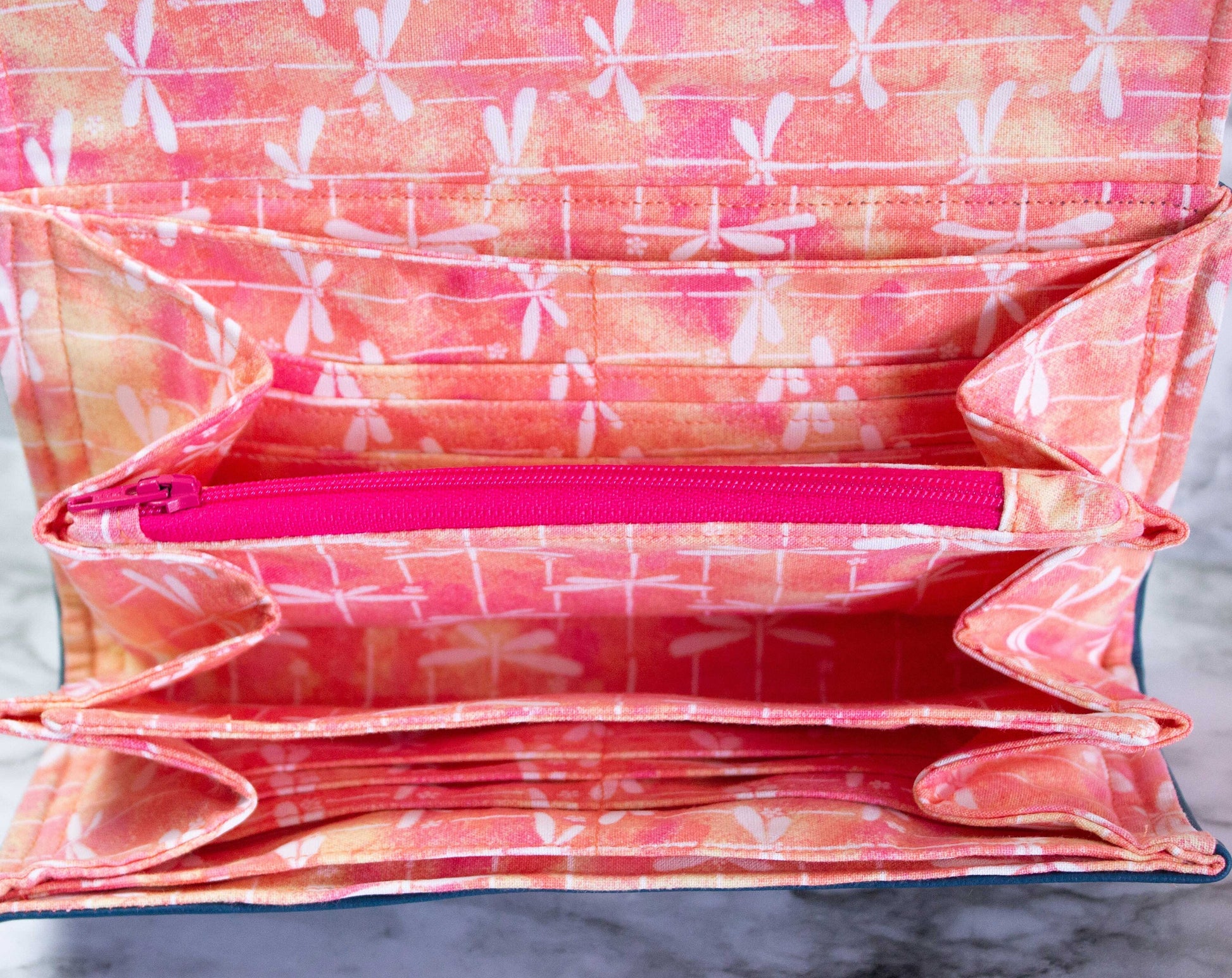 The NCW is the perfect clutch wallet to fit everything you need. Large enough to fit your phone, money, cards, and more. This wallet features a custom Dare to Dream fabric from HookedandHemmed, accented with teal vinyl. The interior features pink dragonfly fabric.