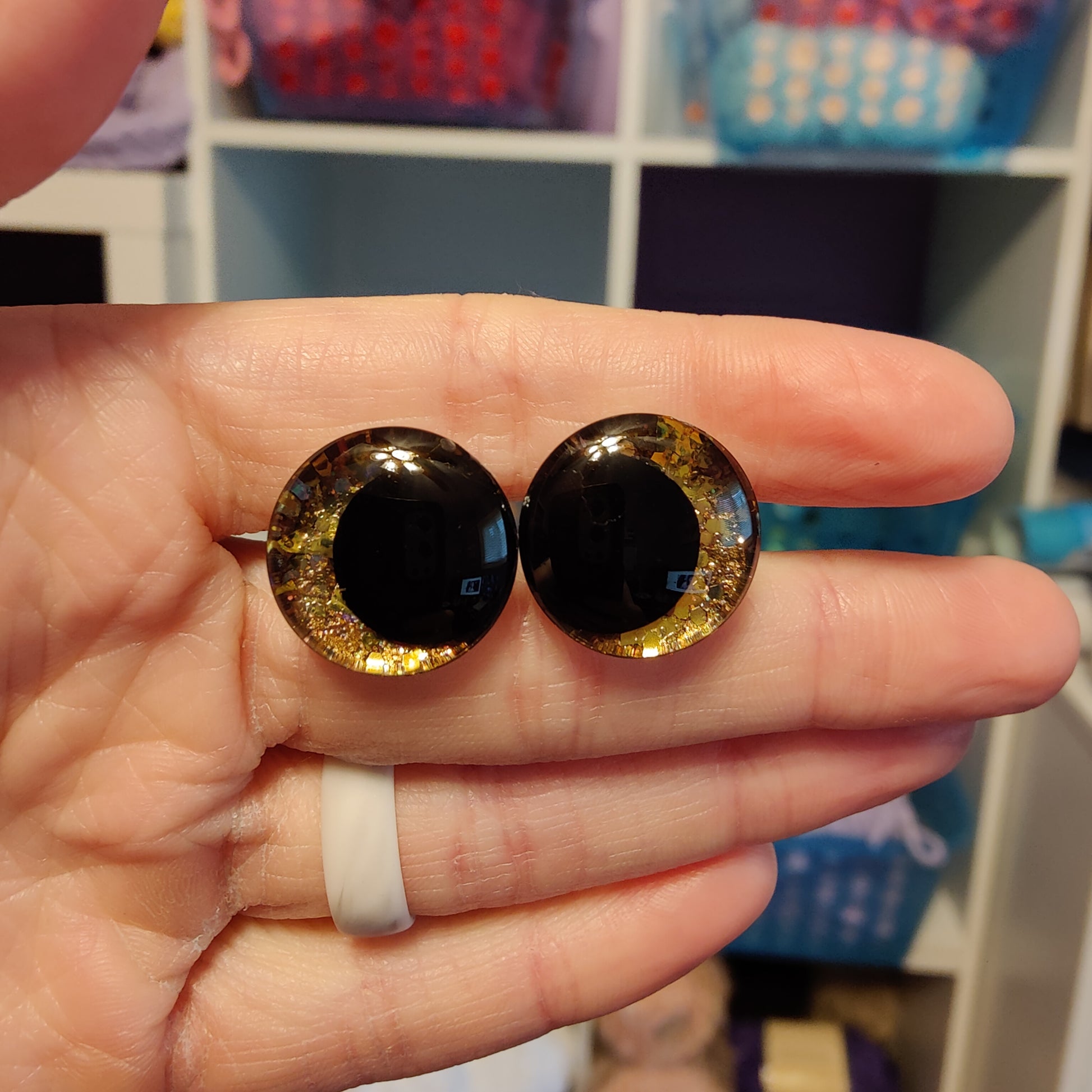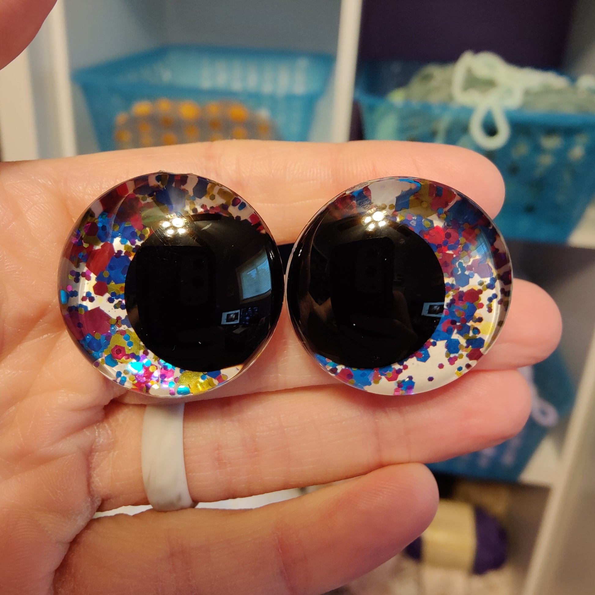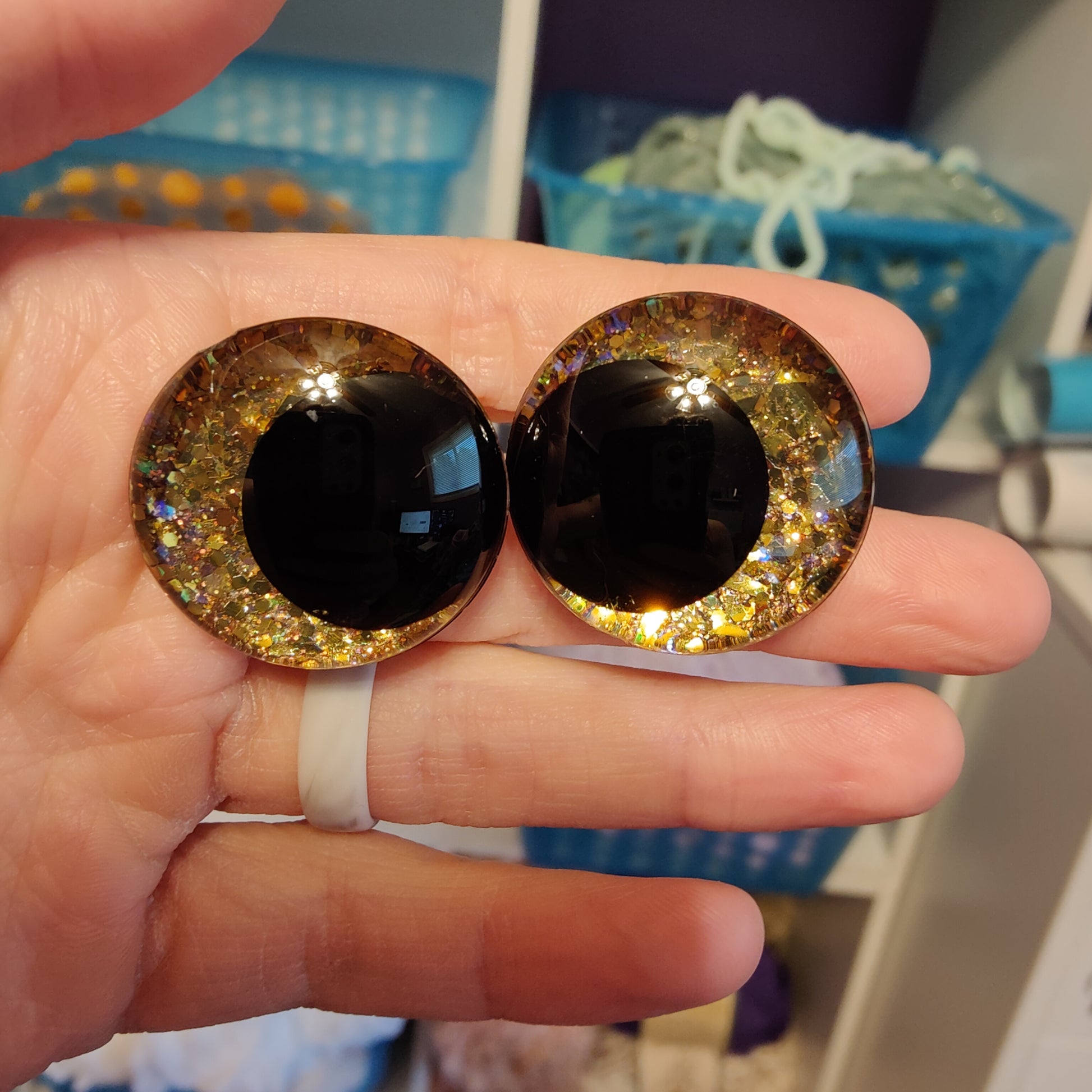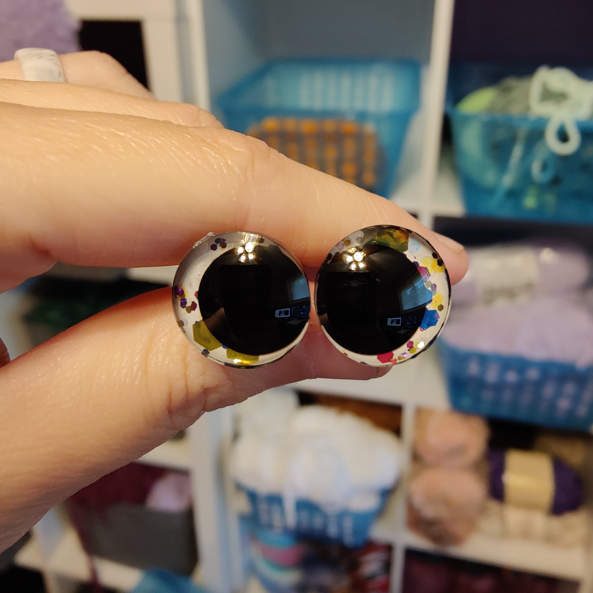 These safety eyes are hand painted with glitter and paint for a super vibrant and glittery look. They are sealed and durable.