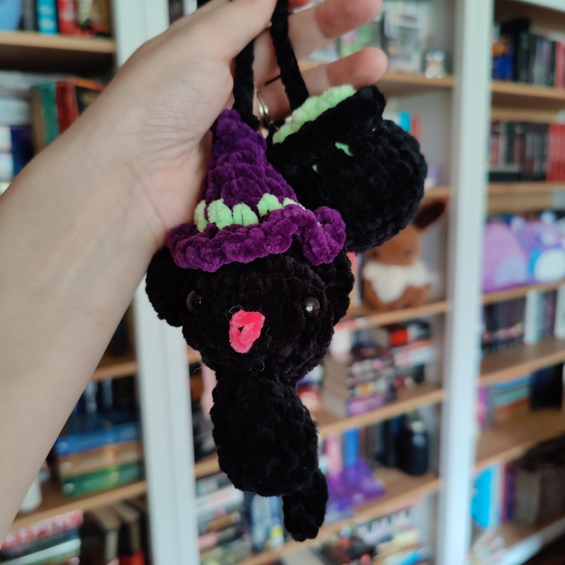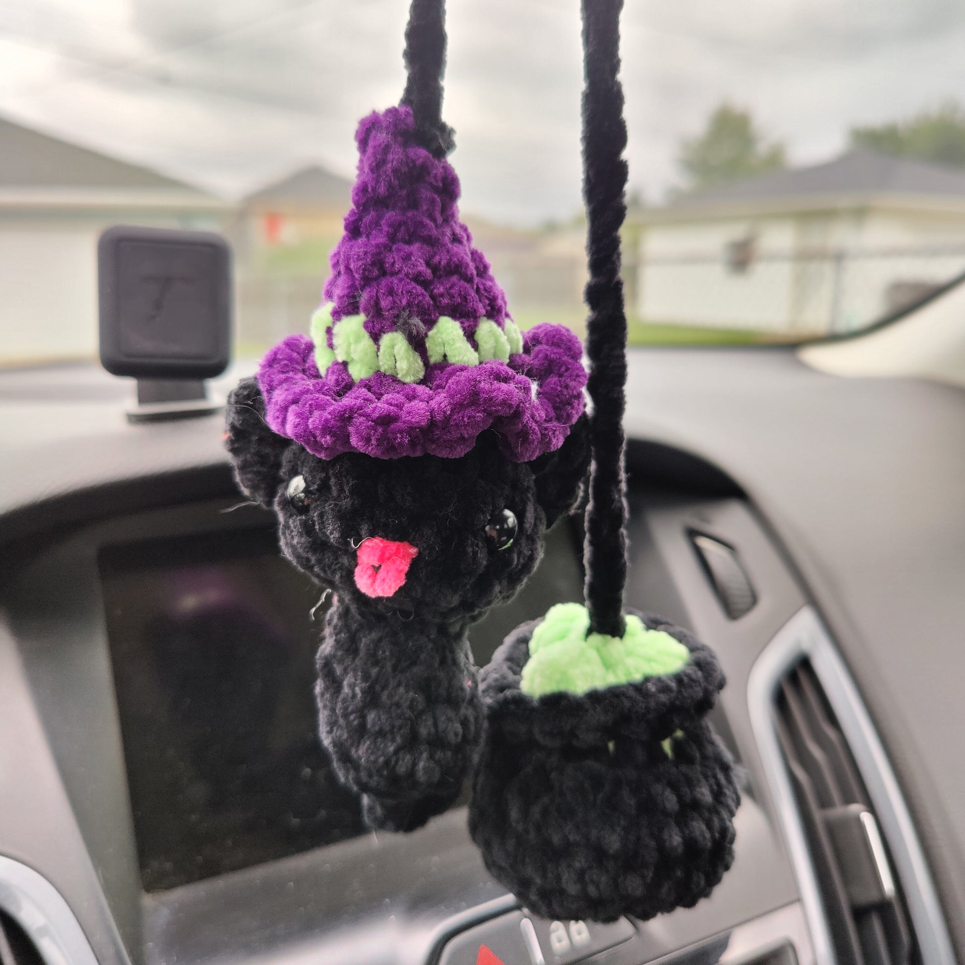 This adorable Cat and Cauldron car charm is perfect for spooky season. Dress up your car's review mirror with this hanging Halloween plushie set.