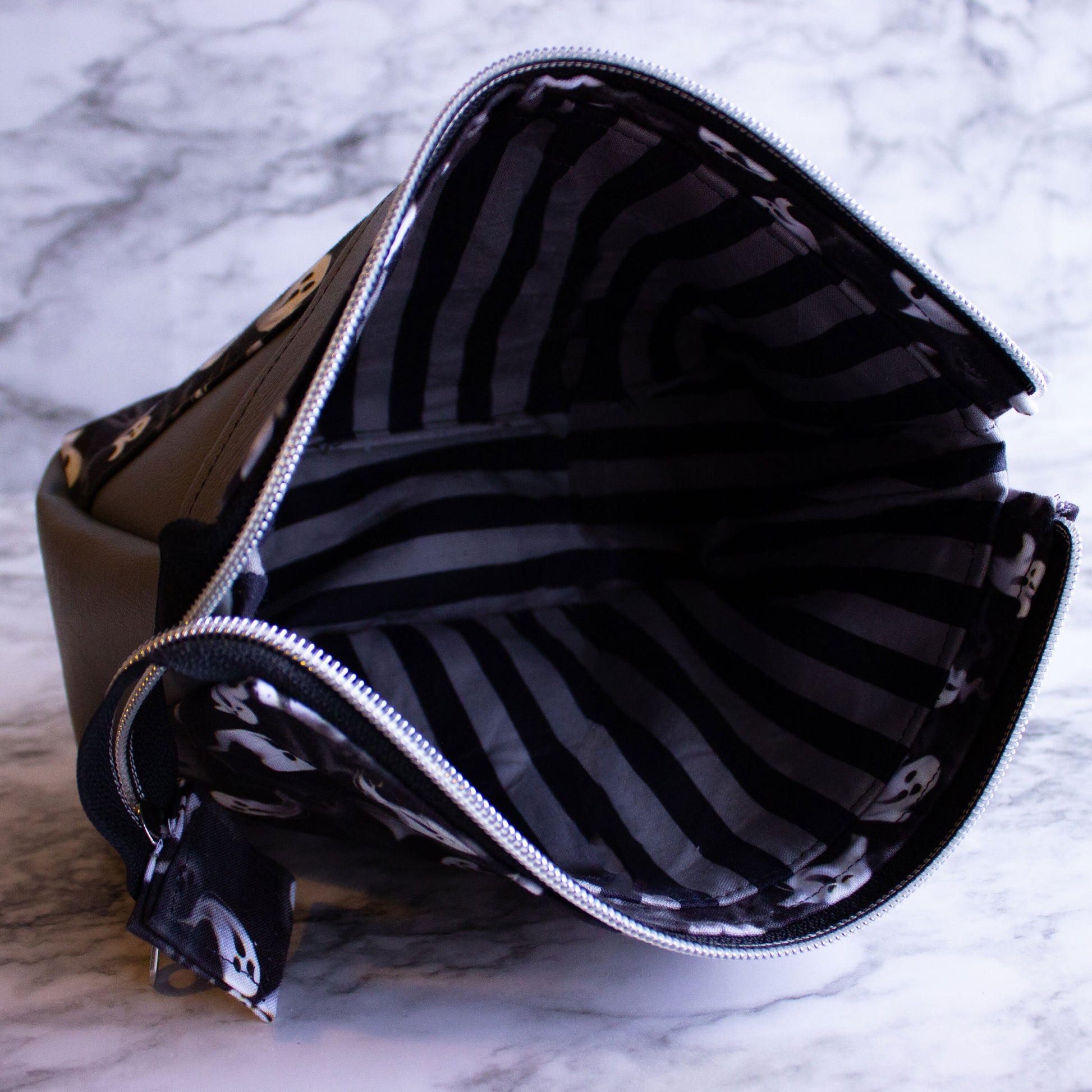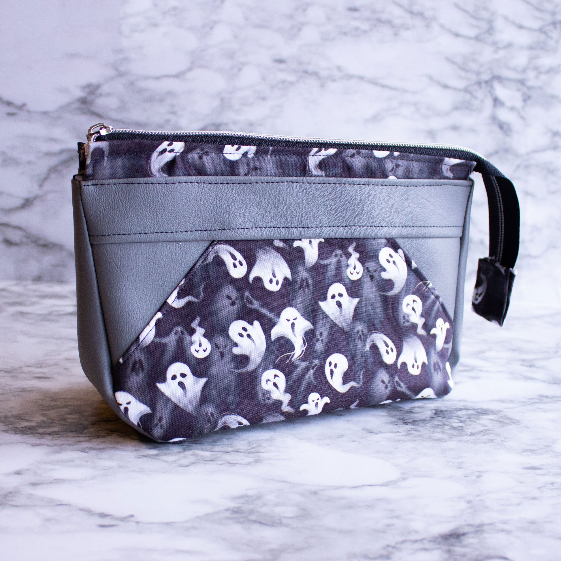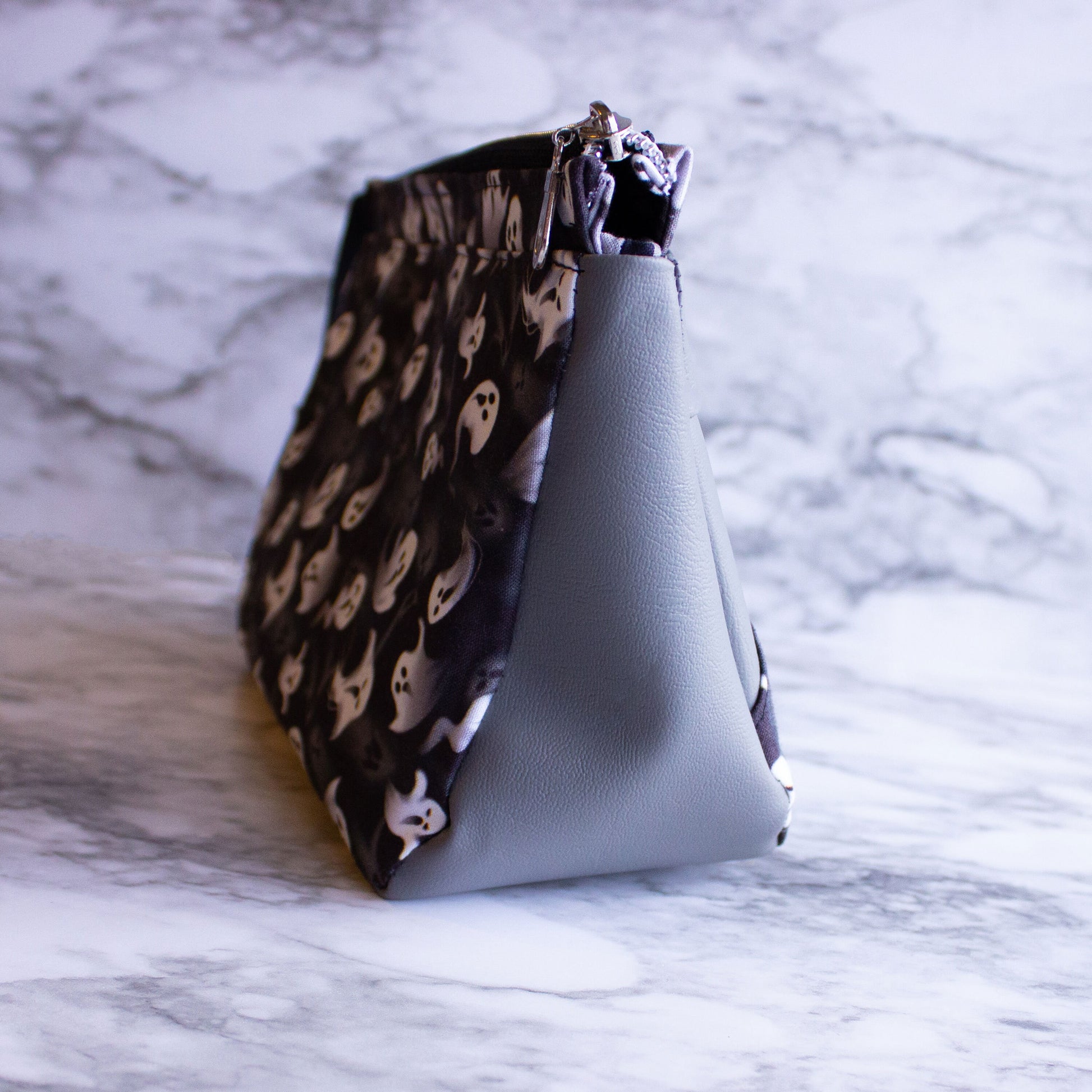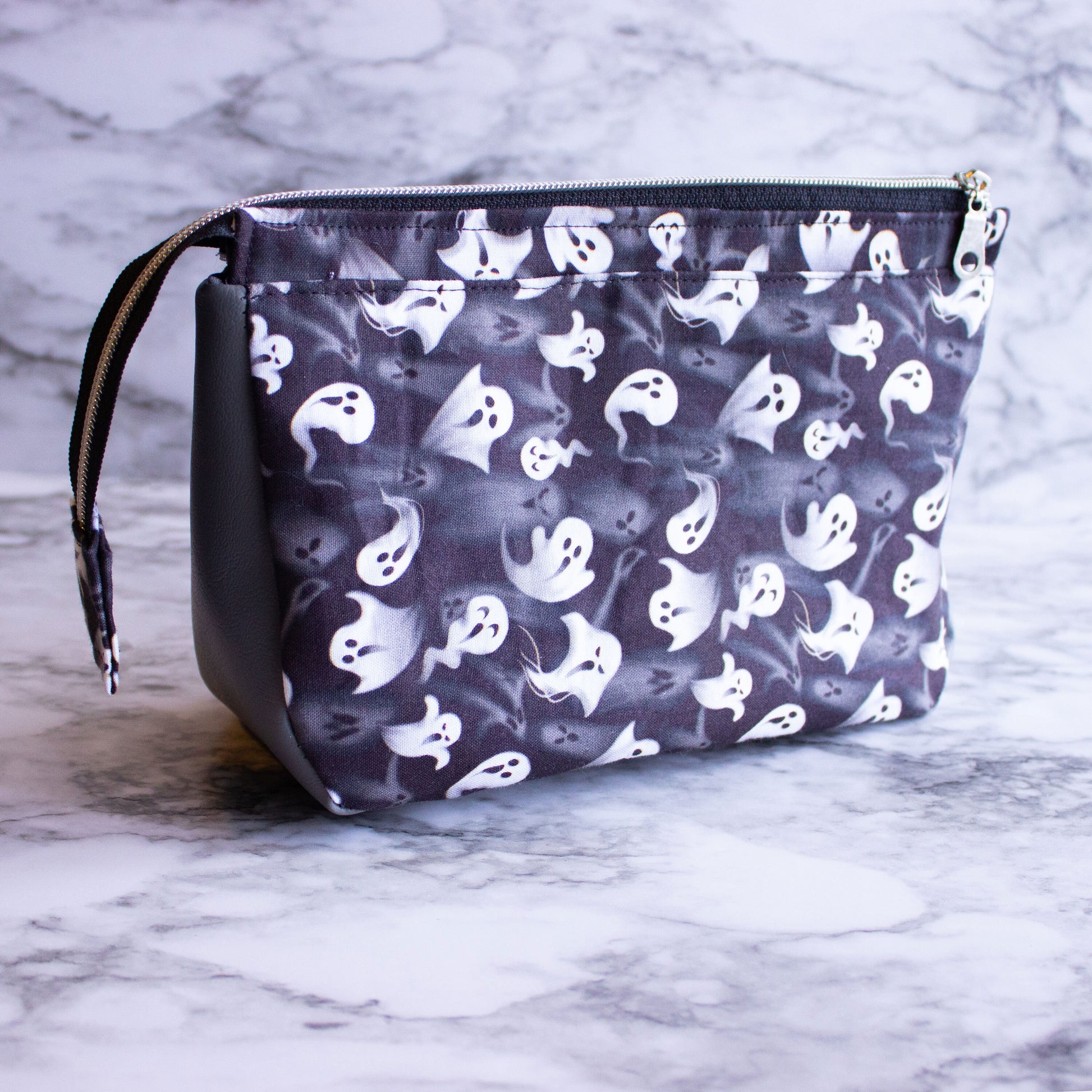 Perfect pouch for all you spooky ghouls. This pouch features a black ghost print cotton with grey vinyl accents. The inside is lined with a black and gray striped cotton. The zipper closure keeps your items secure. Great for use as a makeup bag, pencil case, or small clutch bag. The gusseted design allows for extra room and the small bag can pack a lot!