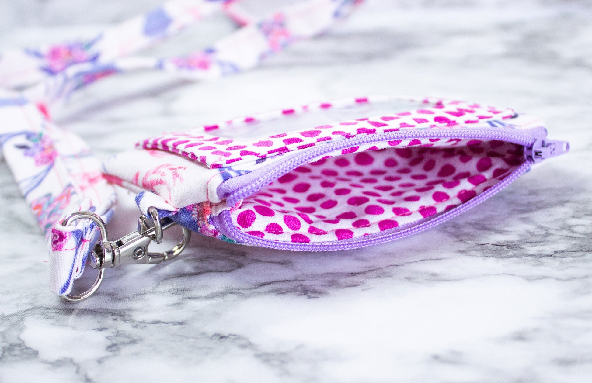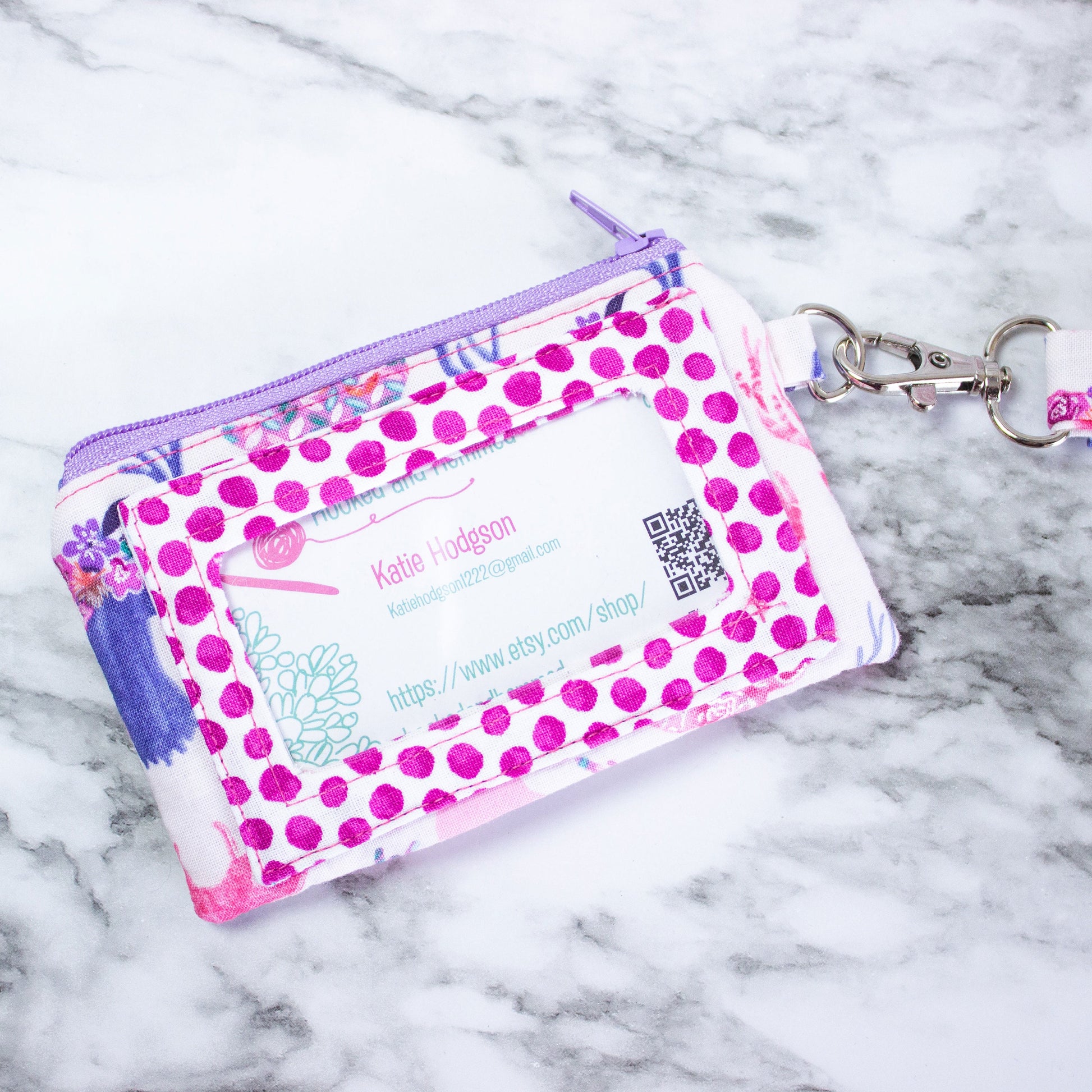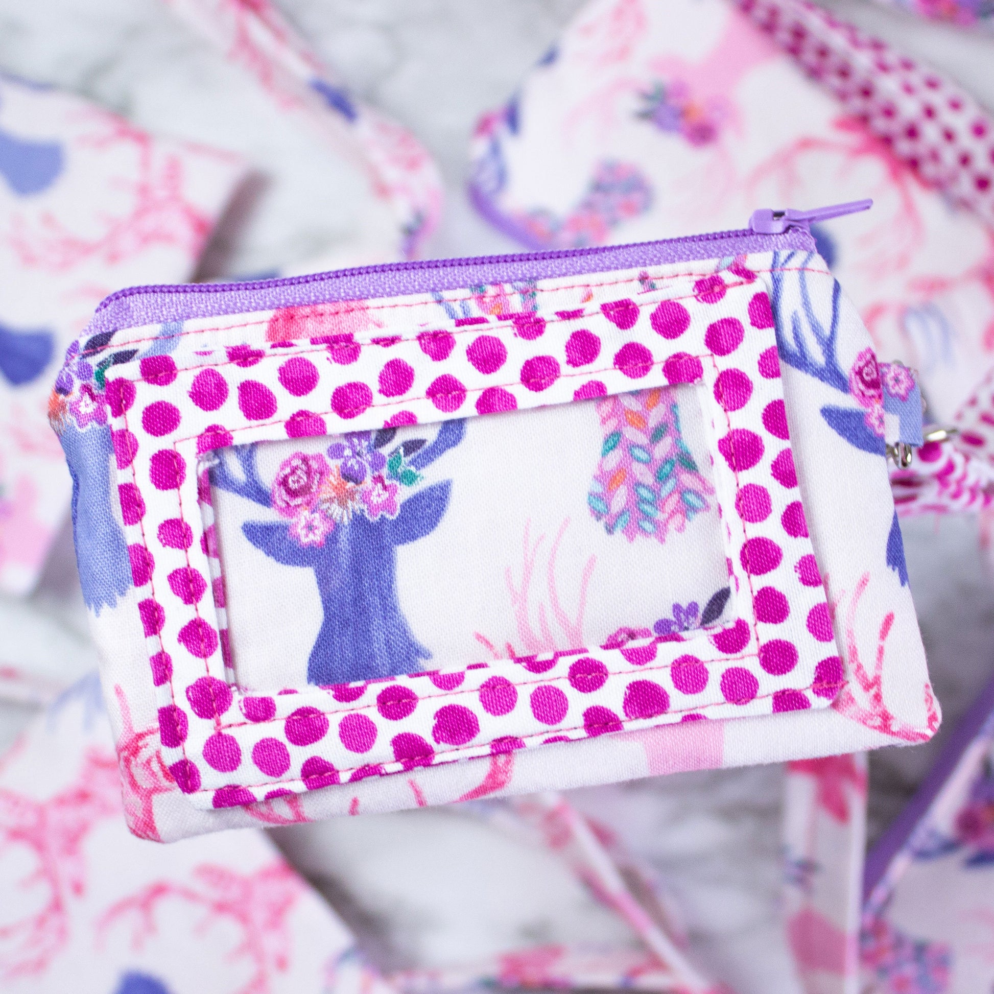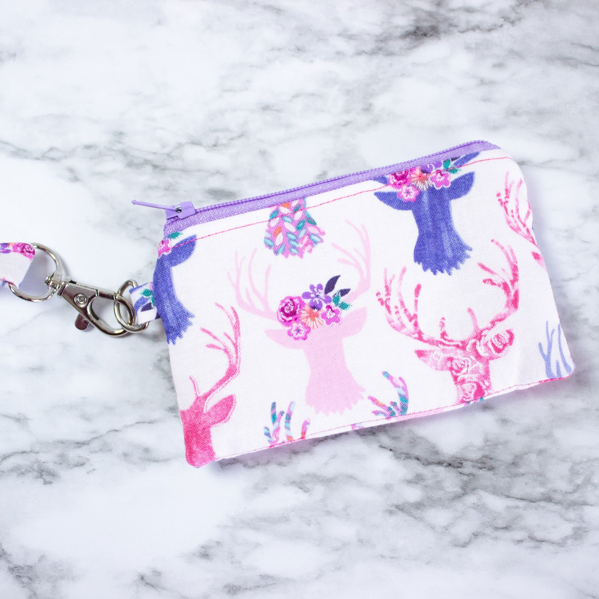 This zippered ID wallet lanyard, coin purse is handcrafted with cotton fabric featuring a Floral Deer print and a pink polka dot interior. The clear vinyl window allows for easy access to your ID's and badges. This ID wallet comes with a lanyard to carry around with convenience. The zippered pouch secures coins, money, and cards so everything you need is ready to go.