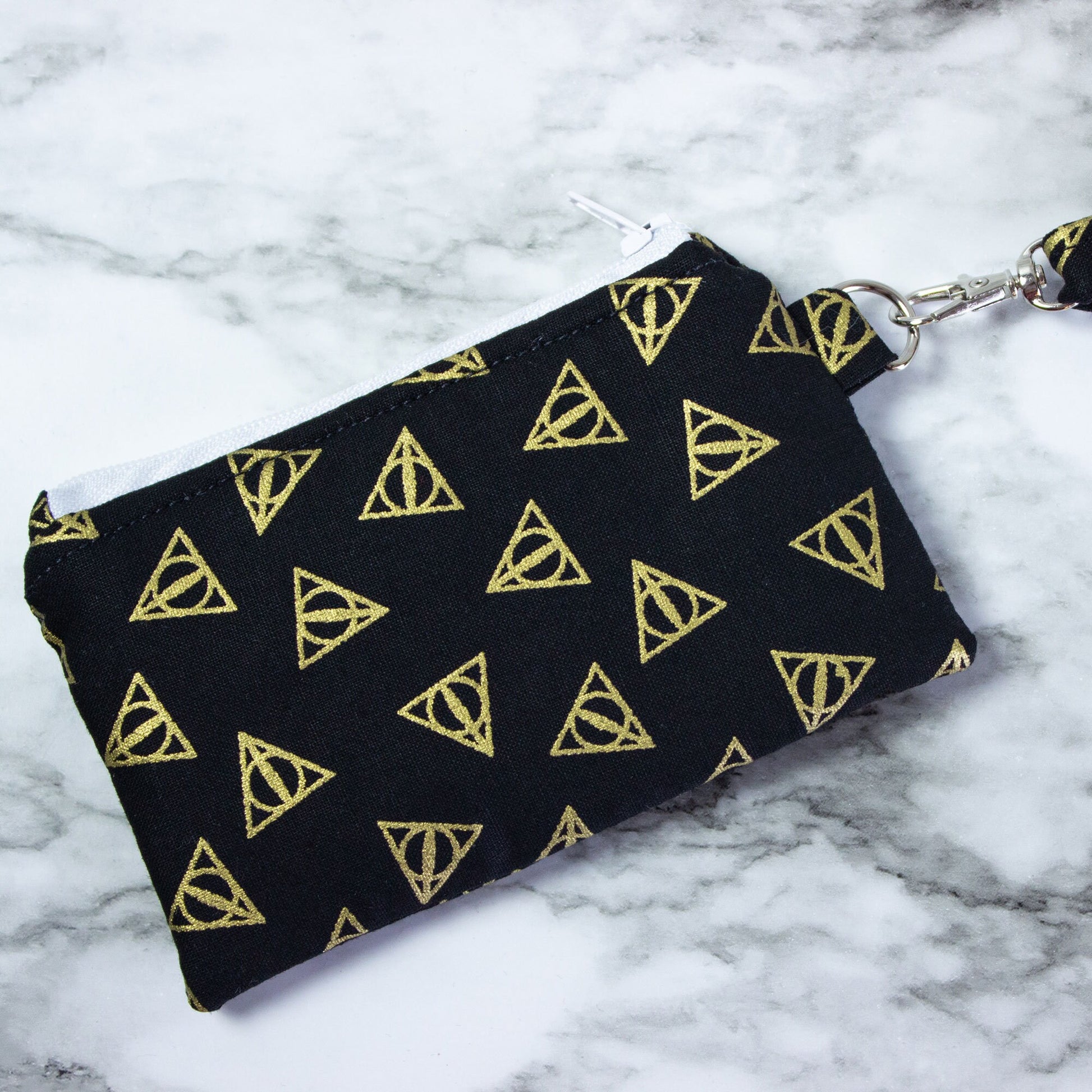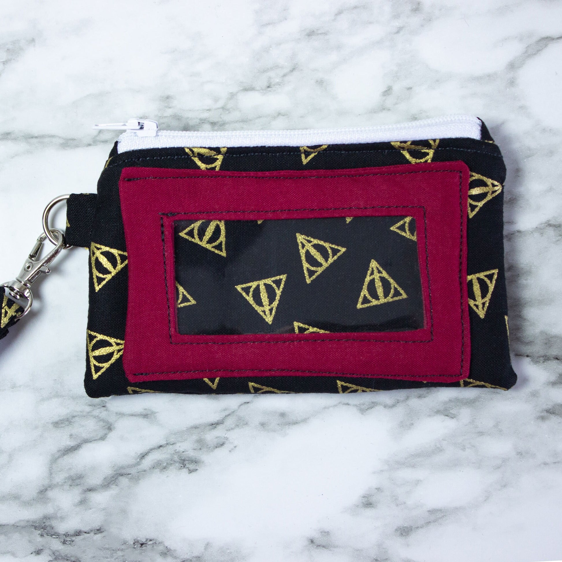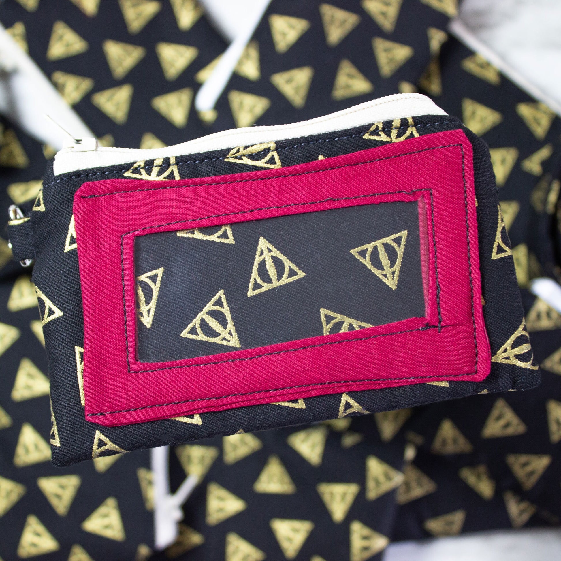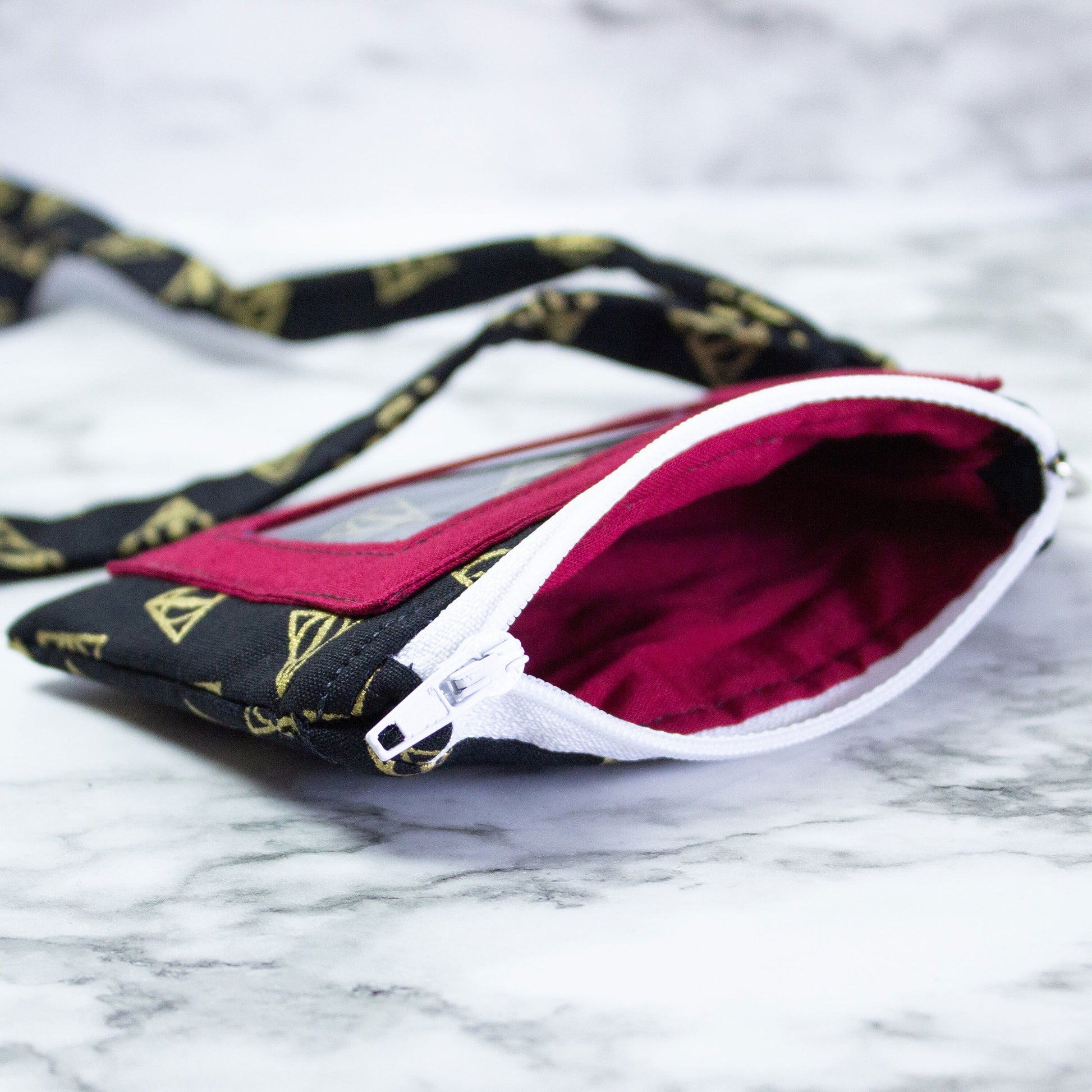 This zippered ID wallet lanyard, coin purse is handcrafted with cotton fabric featuring The Deathly Hallows print and a dark red interior lining. The clear vinyl window allows for easy access to your ID's and badges. This ID wallet comes with a lanyard to carry around with convenience. The zippered pouch secures coins, money, and cards so everything you need is ready to go.
