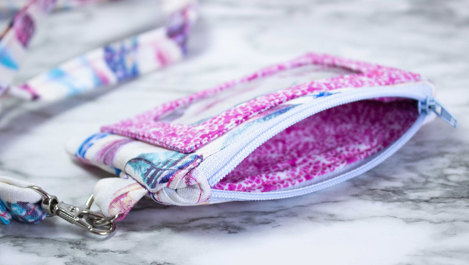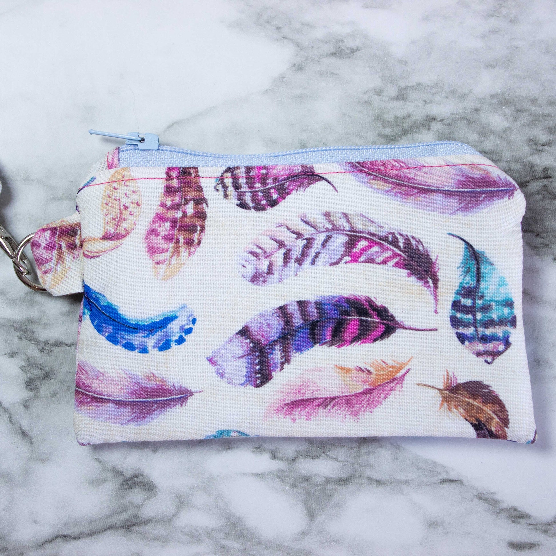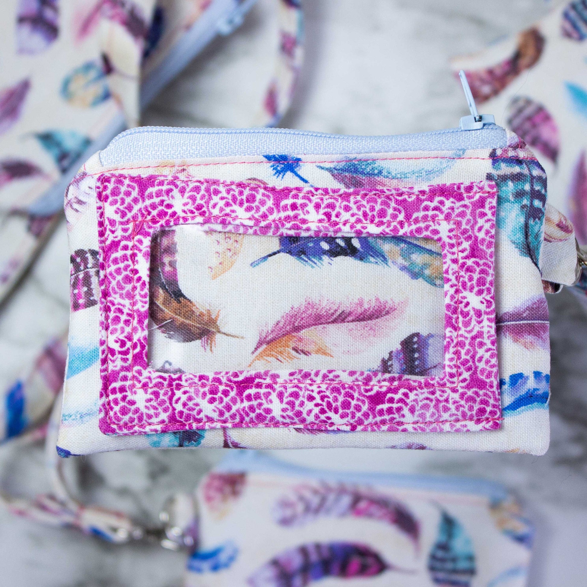 This zippered ID wallet lanyard, coin purse is handcrafted with cotton fabric featuring Watercolor feathers print and a dark pink patterned interior lining. The clear vinyl window allows for easy access to your ID's and badges. This ID wallet comes with a lanyard to carry around with convenience. The zippered pouch secures coins, money, and cards so everything you need is ready to go.