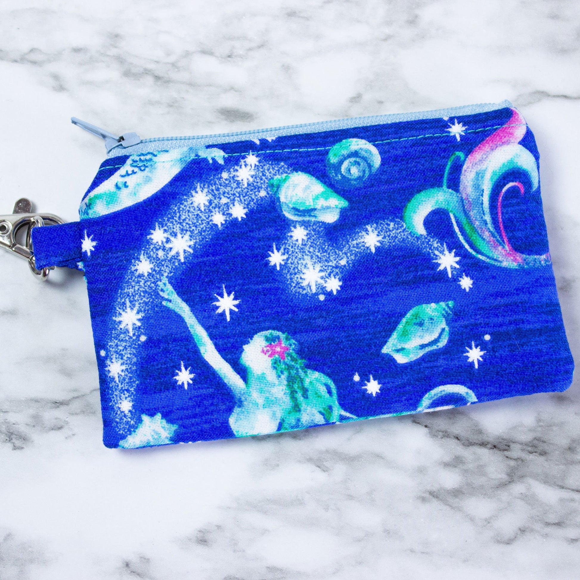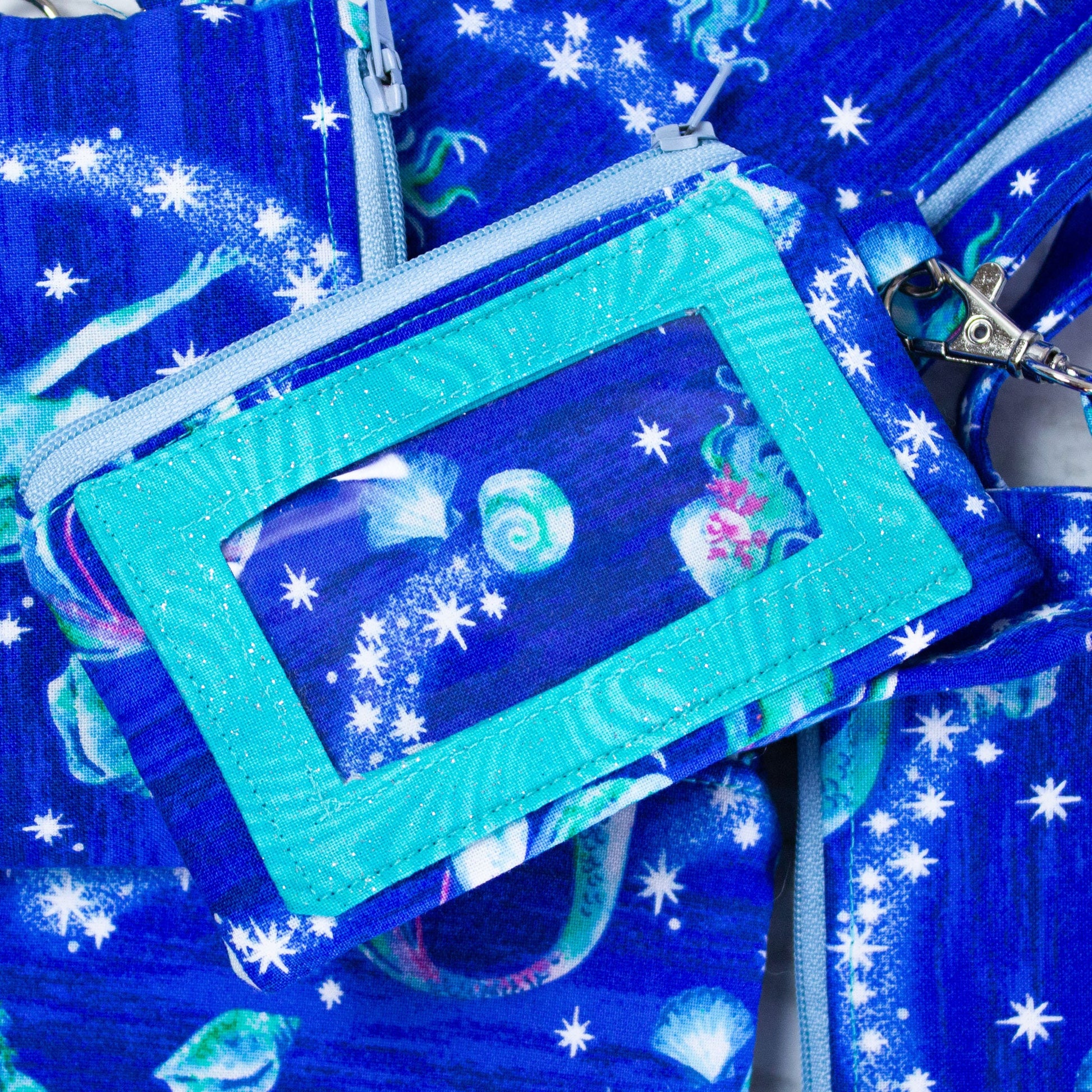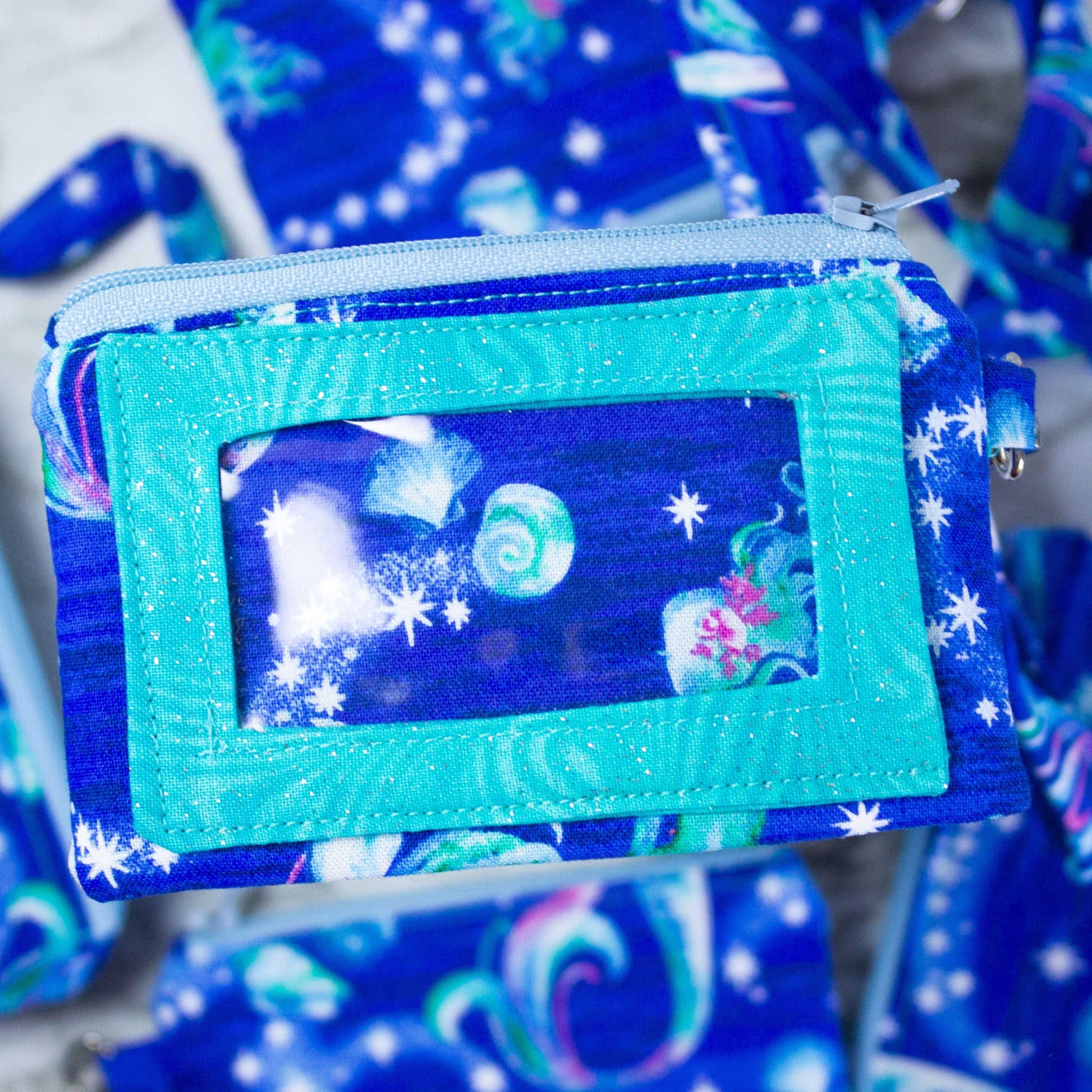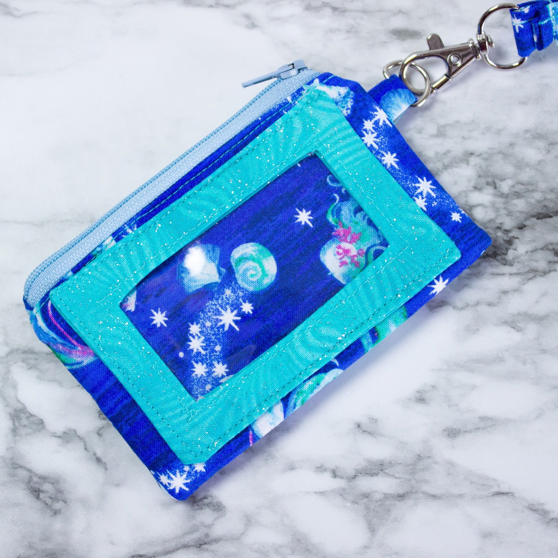 This zippered ID wallet lanyard, coin purse is handcrafted with cotton fabric featuring a Mermaid print and a Glitter teal interior lining. The clear vinyl window allows for easy access to your ID's and badges. This ID wallet comes with a lanyard to carry around with convenience. The zippered pouch secures coins, money, and cards so everything you need is ready to go.