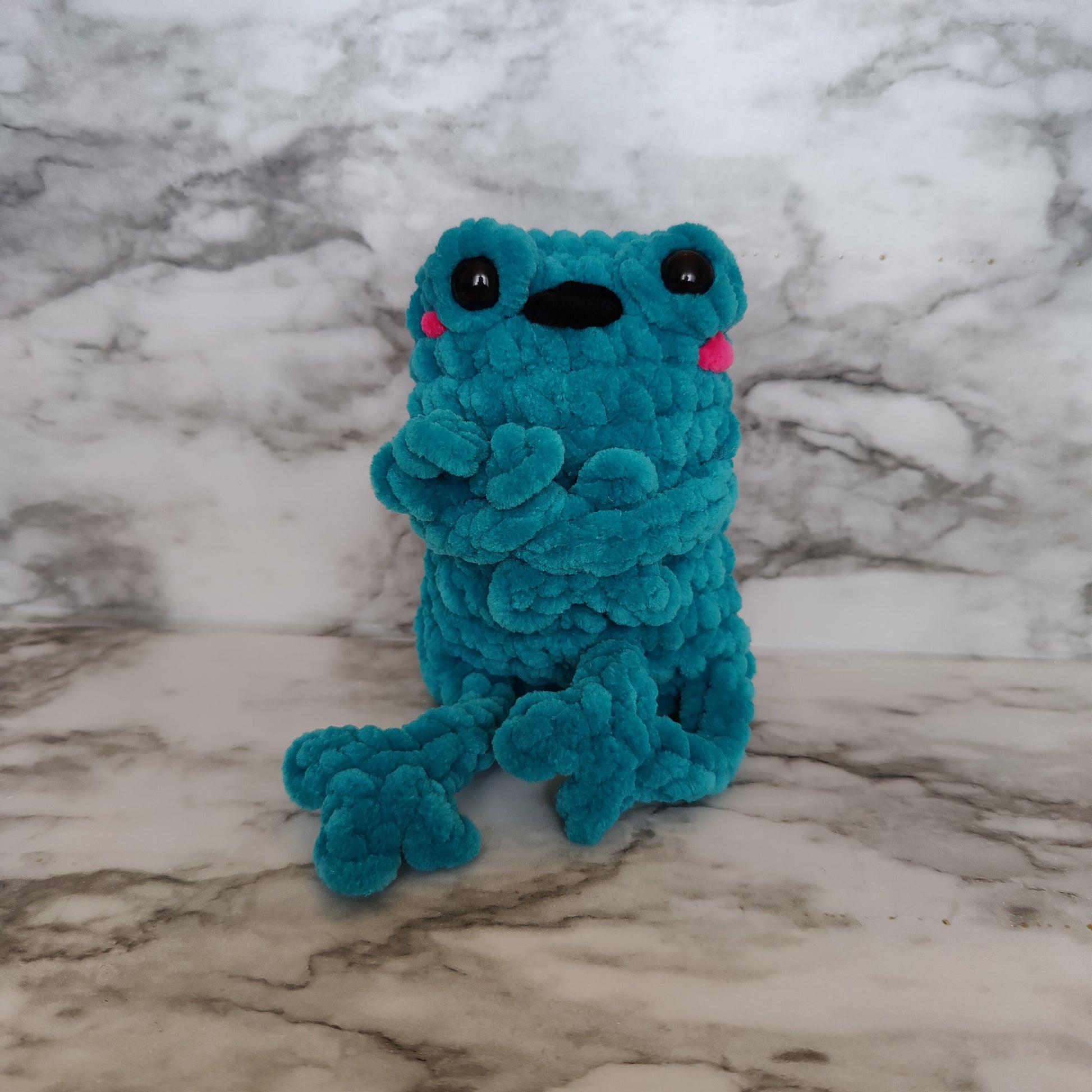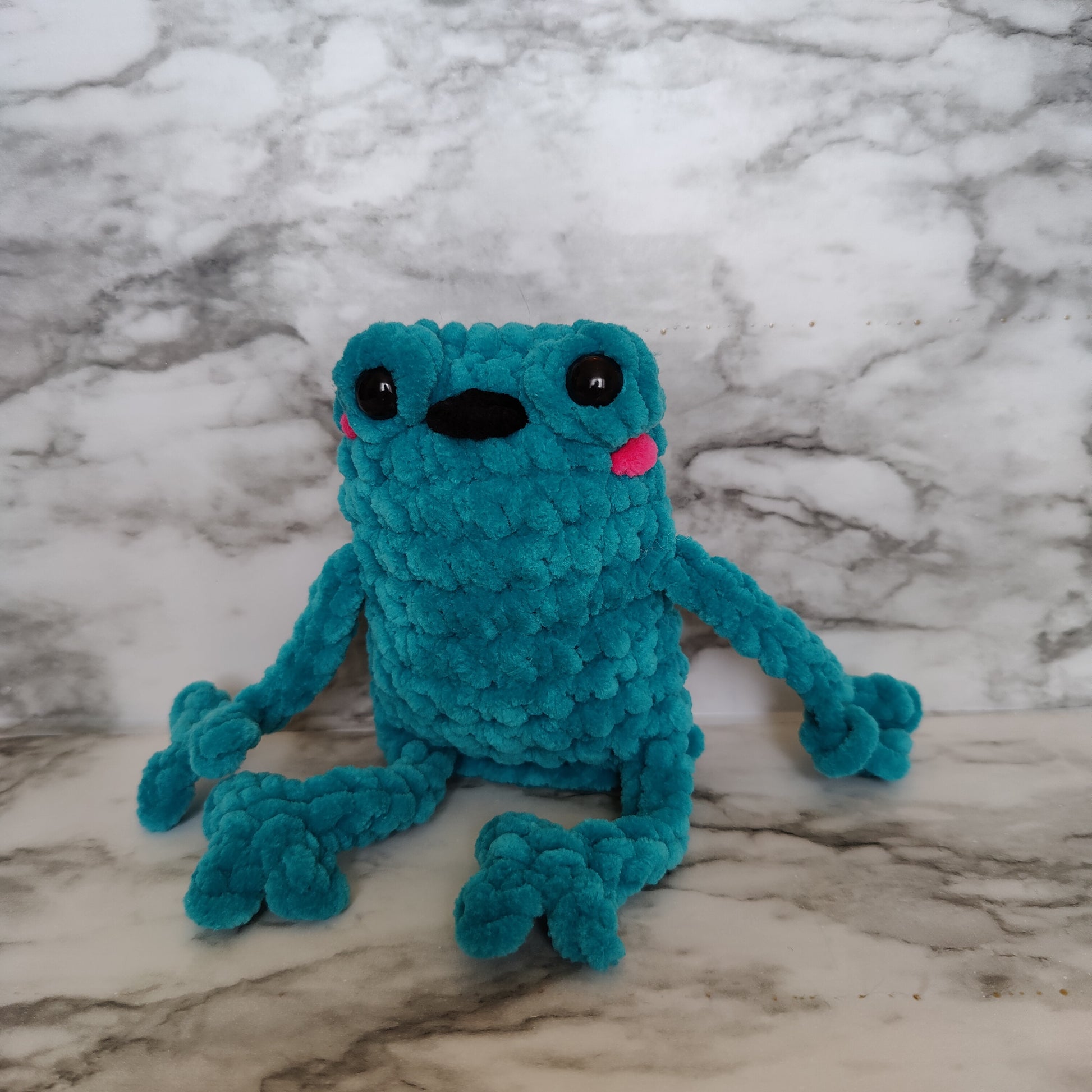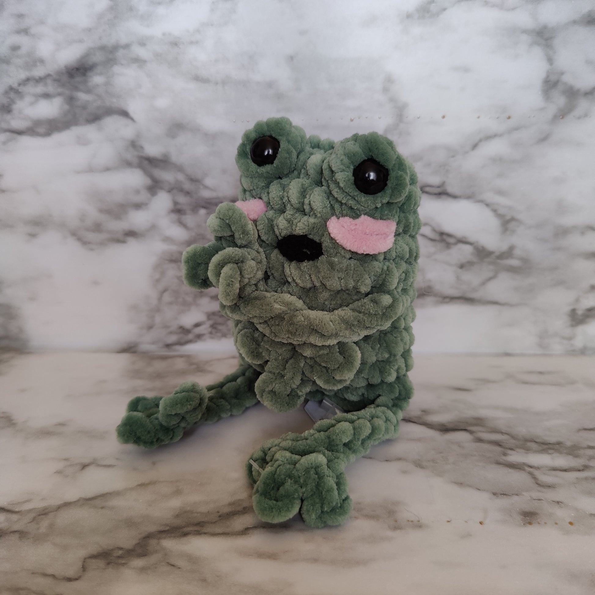 This crochet leggy frog plushie is full of attitude. Cross their arms and sit them on your desk so they can judge you. Made from extra soft chenille yarn.