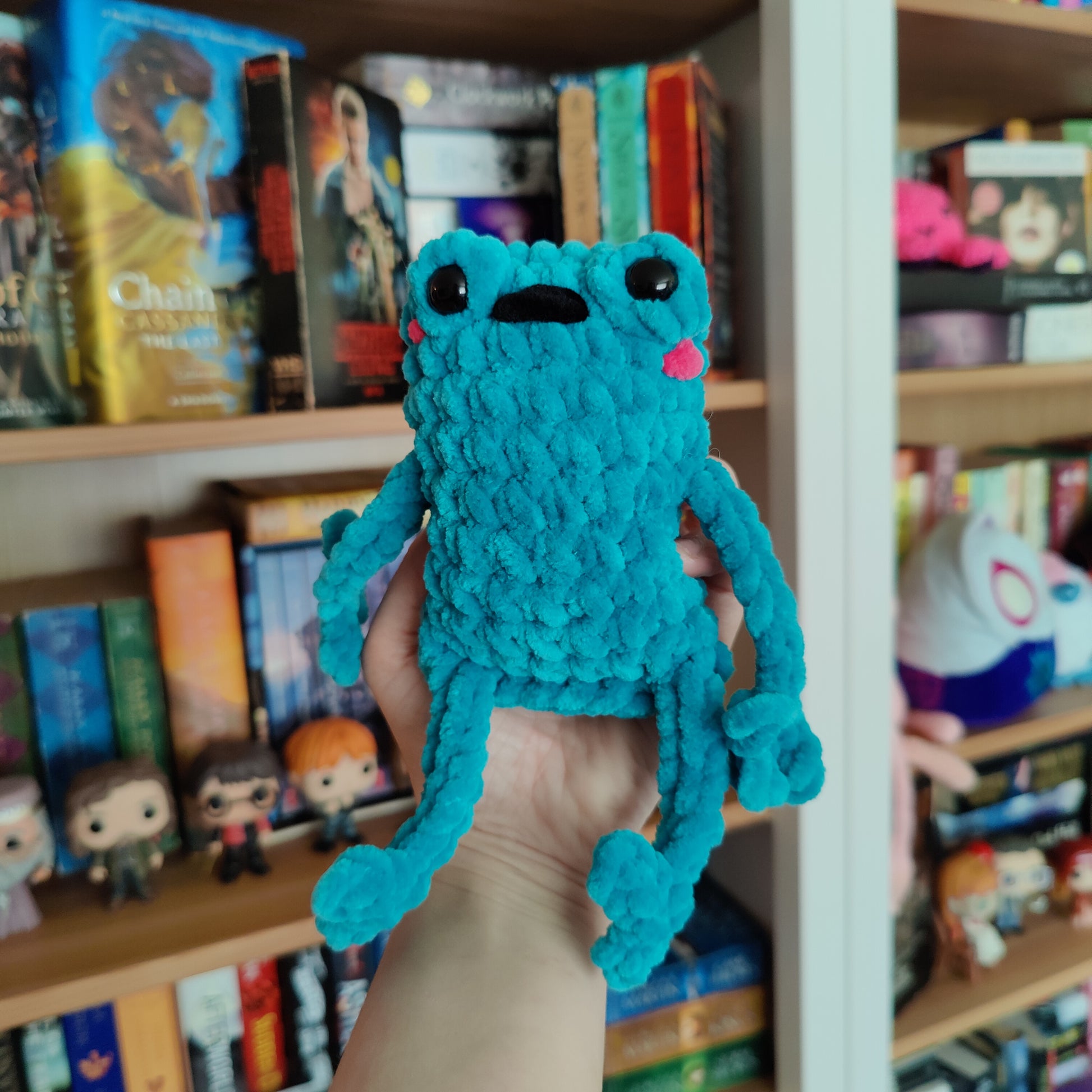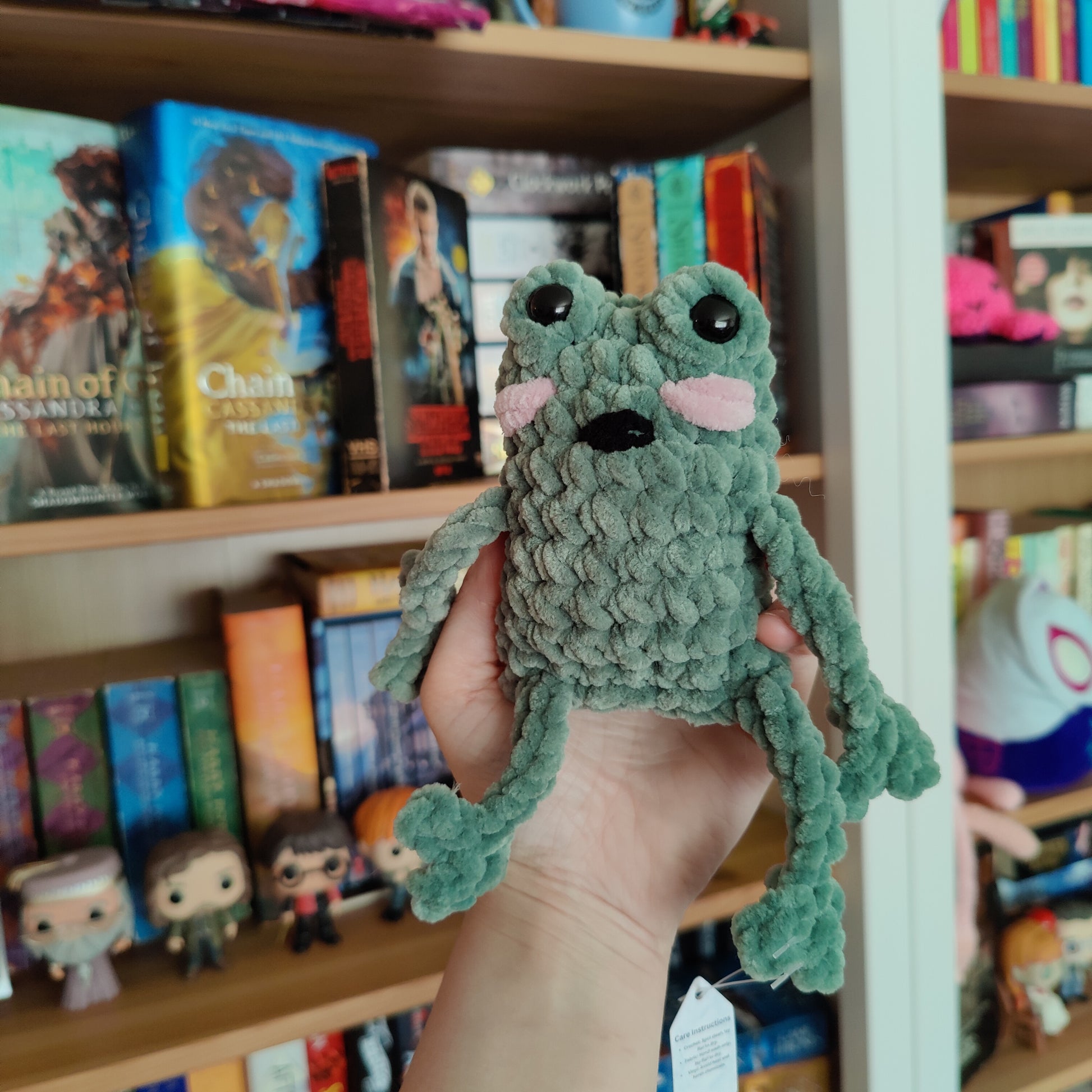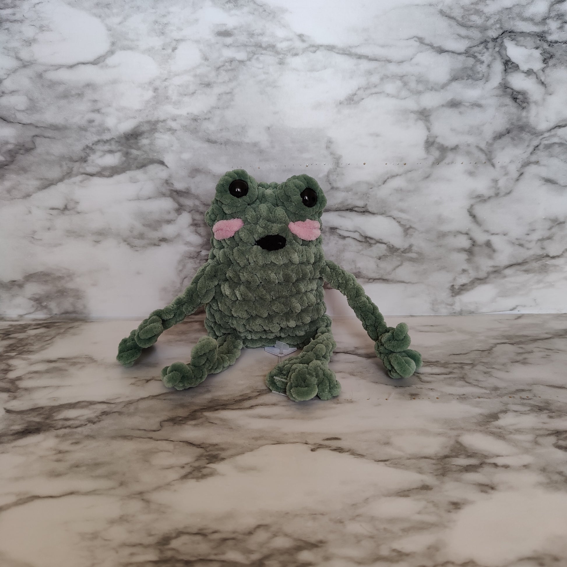 This crochet leggy frog plushie is full of attitude. Cross their arms and sit them on your desk so they can judge you. Made from extra soft chenille yarn.
