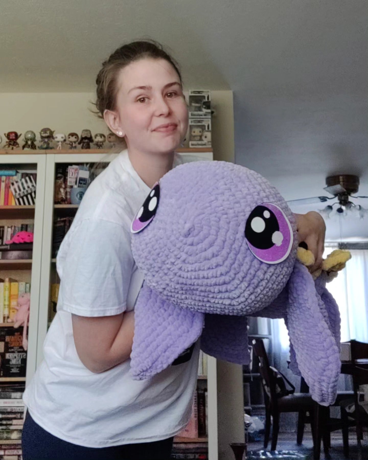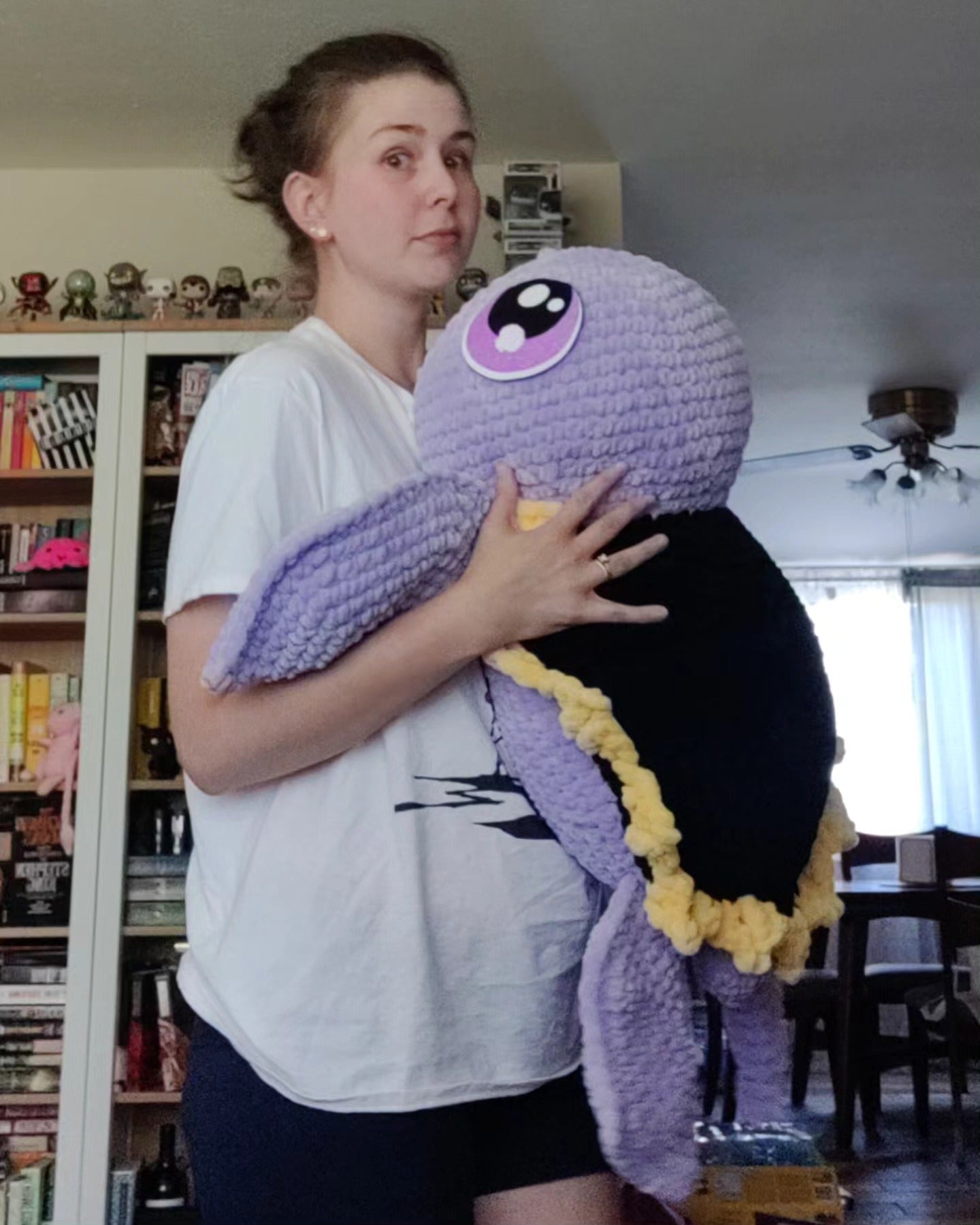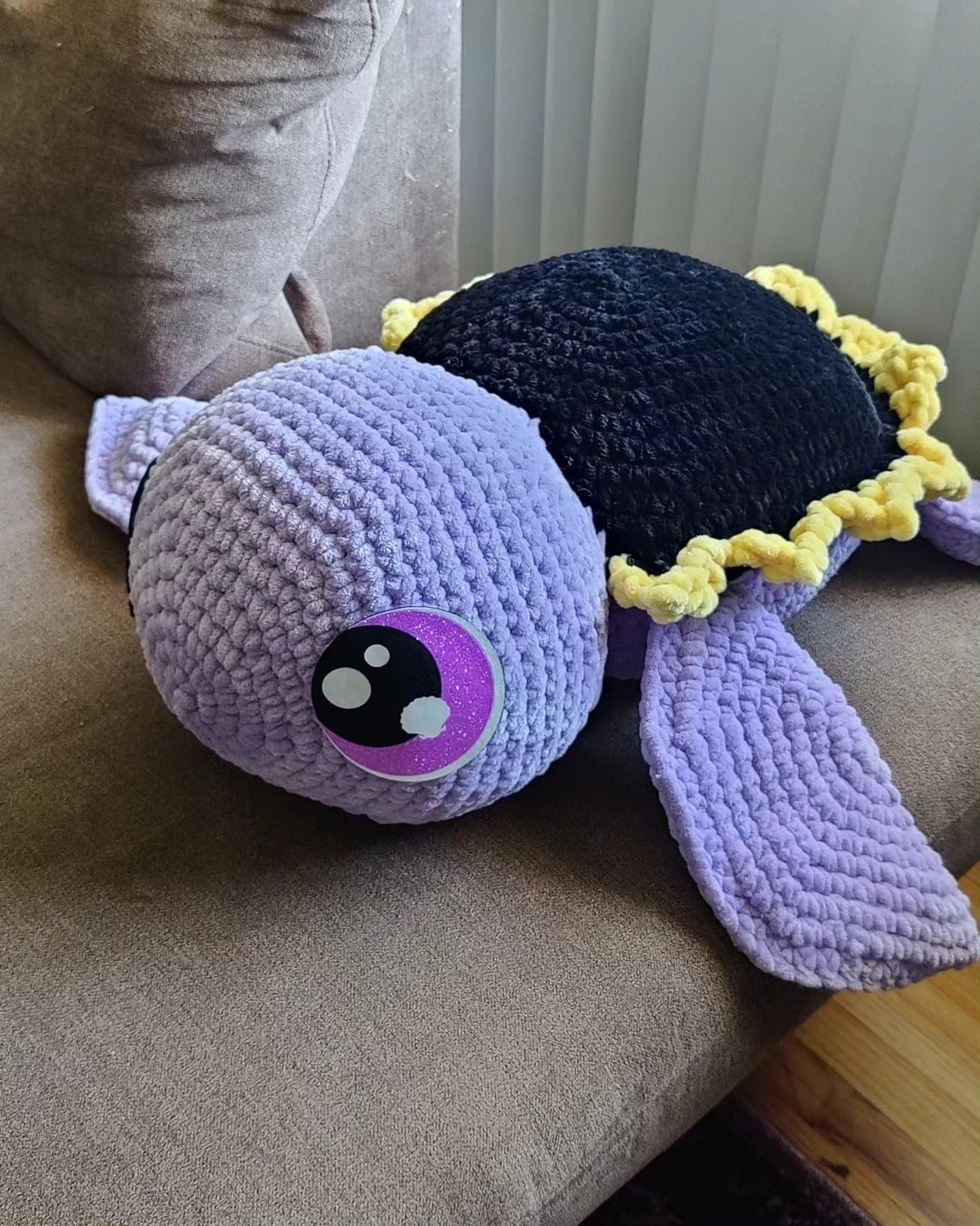 This Turtle measures about 36 inches long and features extra soft blanket yarn. Makes the perfect pillow or snuggle buddy.