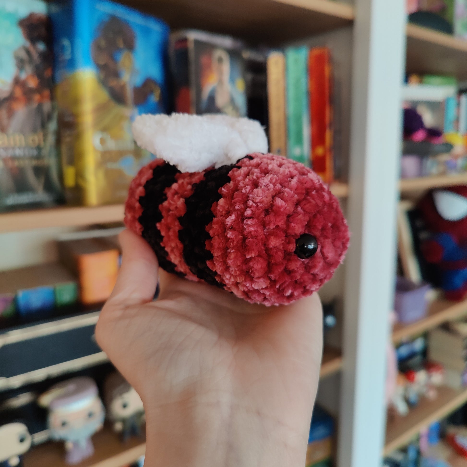 This mini bee is made with soft Bernat Vetvet yarn, giving it a plush look when pet. Small enough to fit into a bag or pocket, sit in a desk, or into a stocking. This little bee can be taken anywhere with ease. Perfect for those moments when you need a little extra comfort in your day.