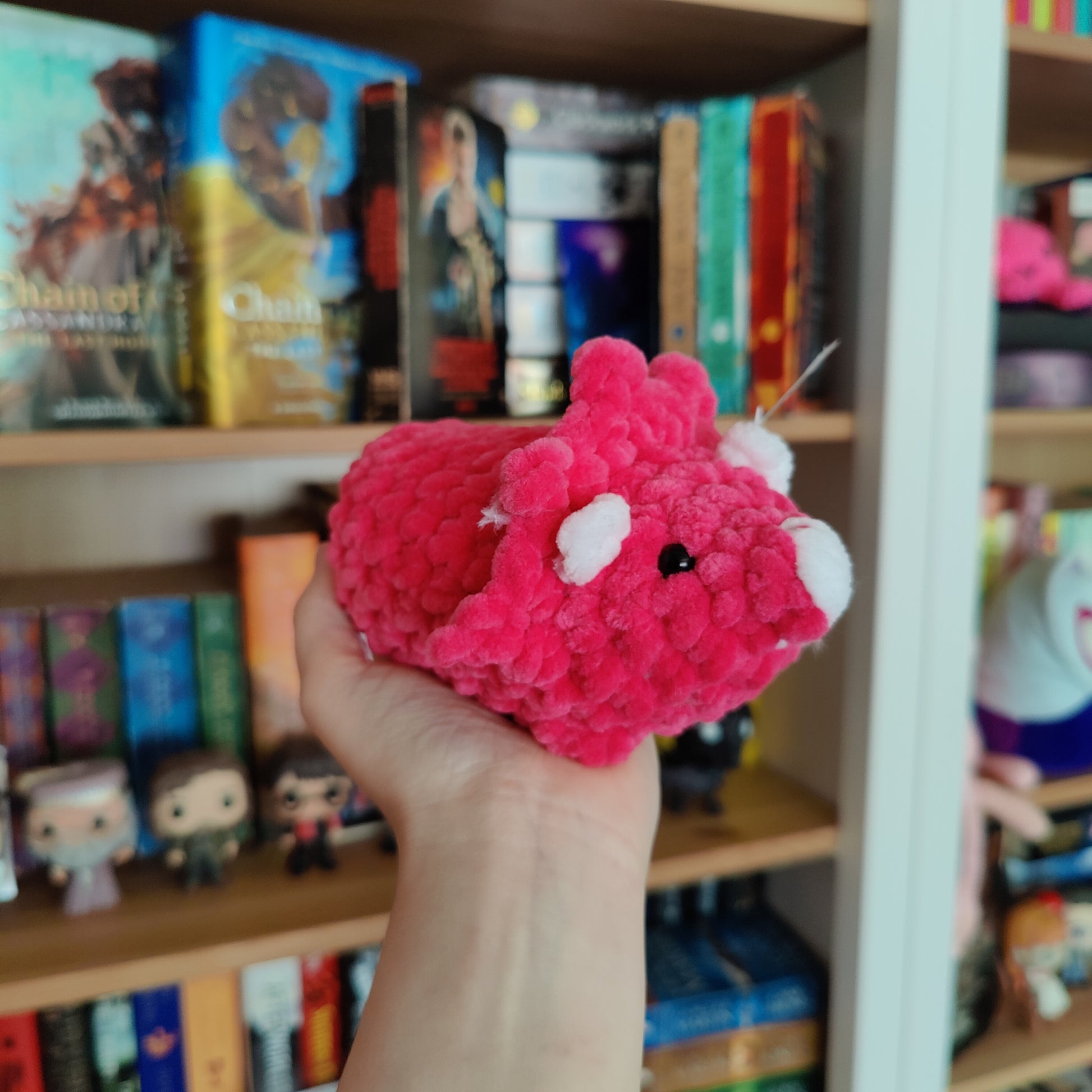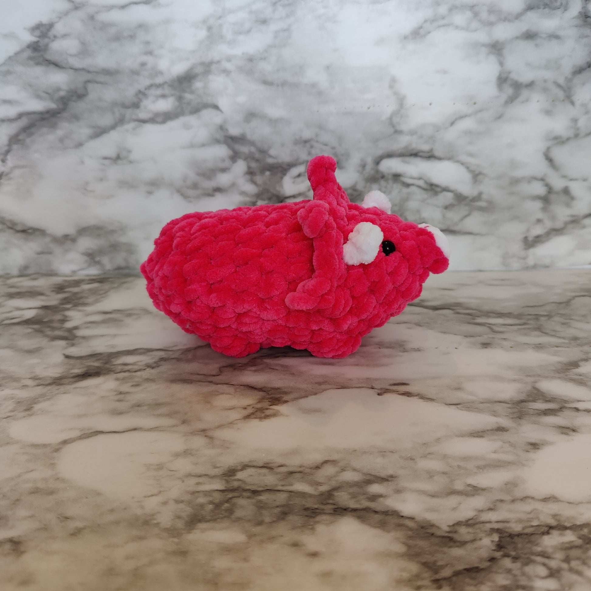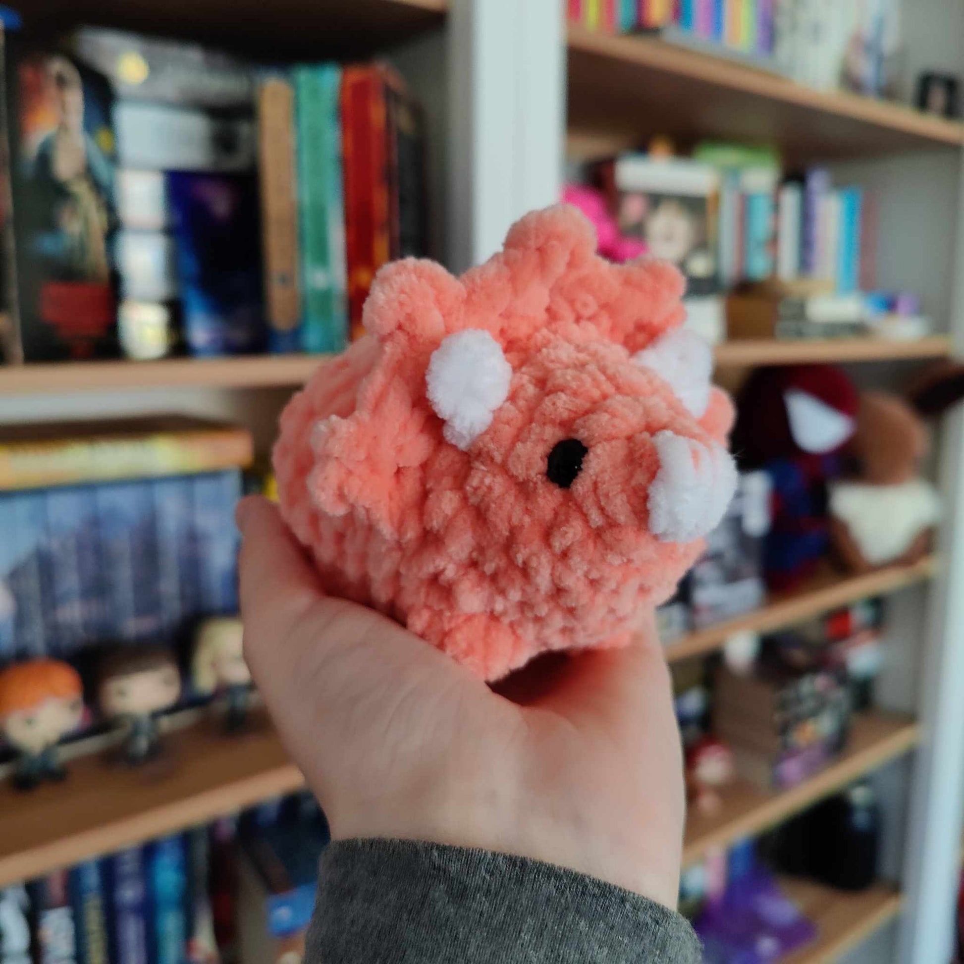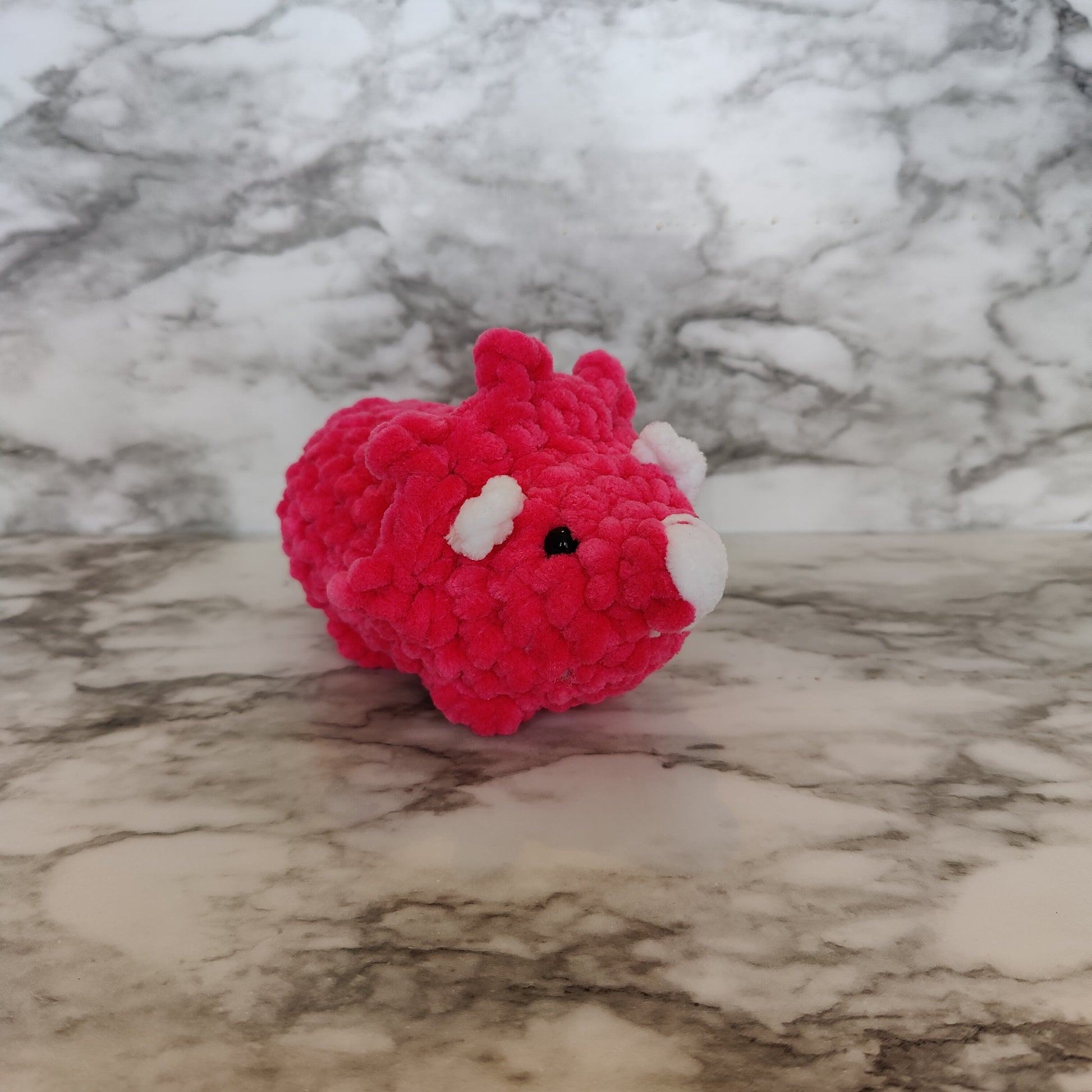 Cute mini crochet triceratops dino. This cute little dinosaur is palm sized and the blanket yarn makes this plush super soft. Perfect to carry around or sit on your desk at work.