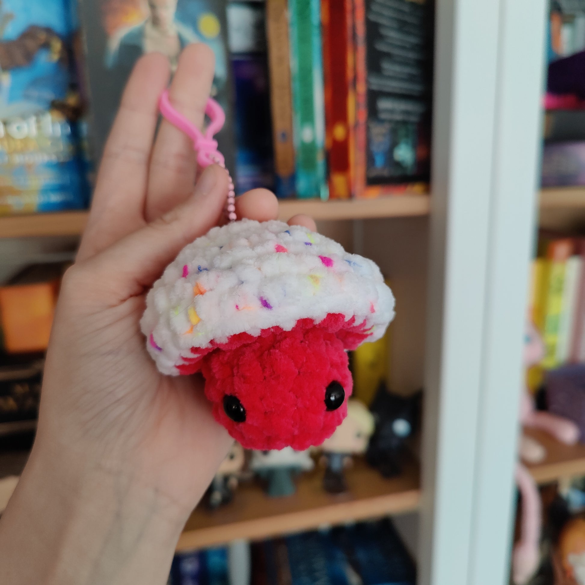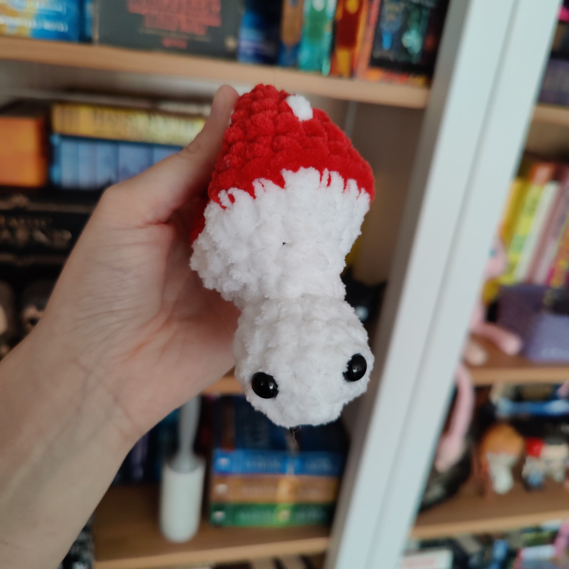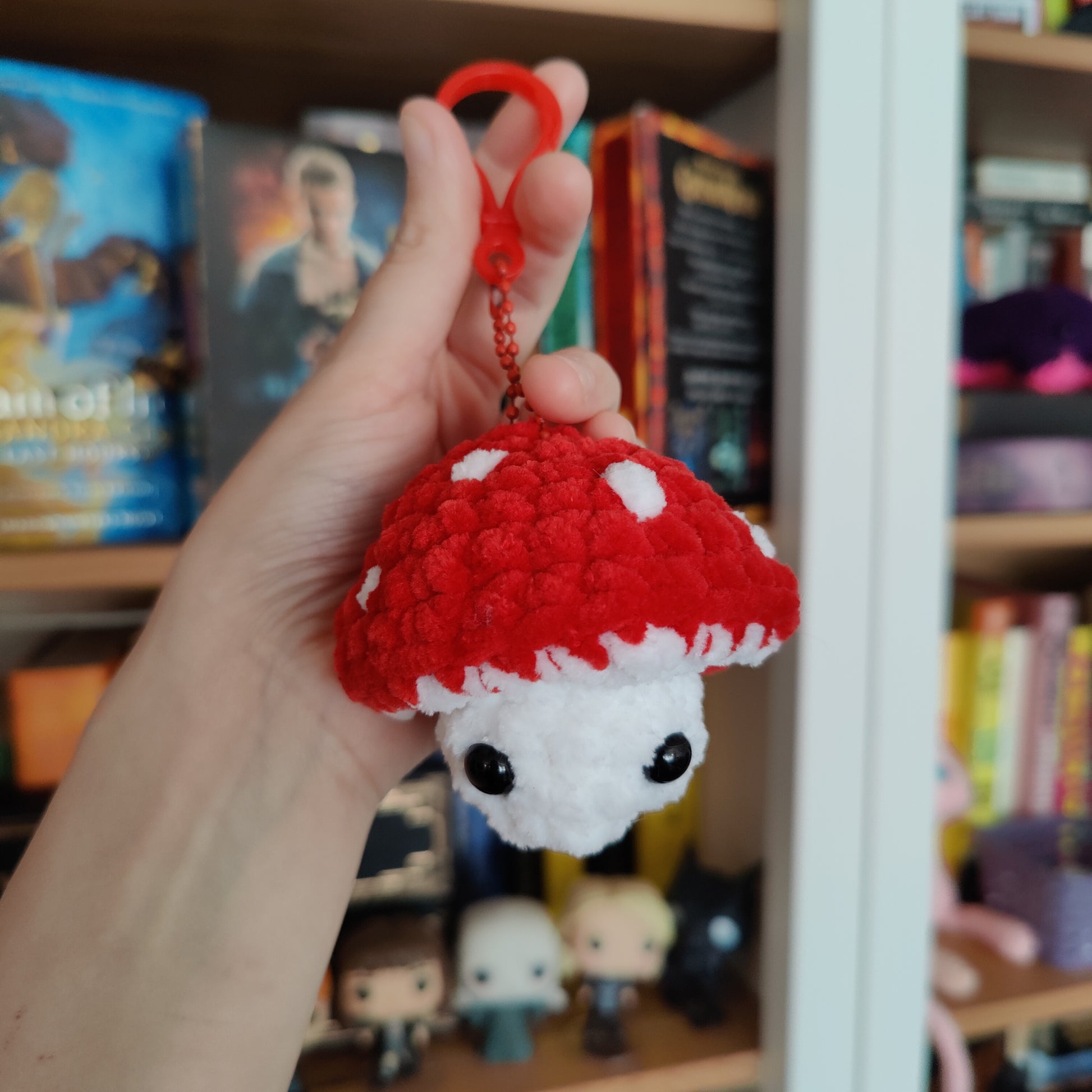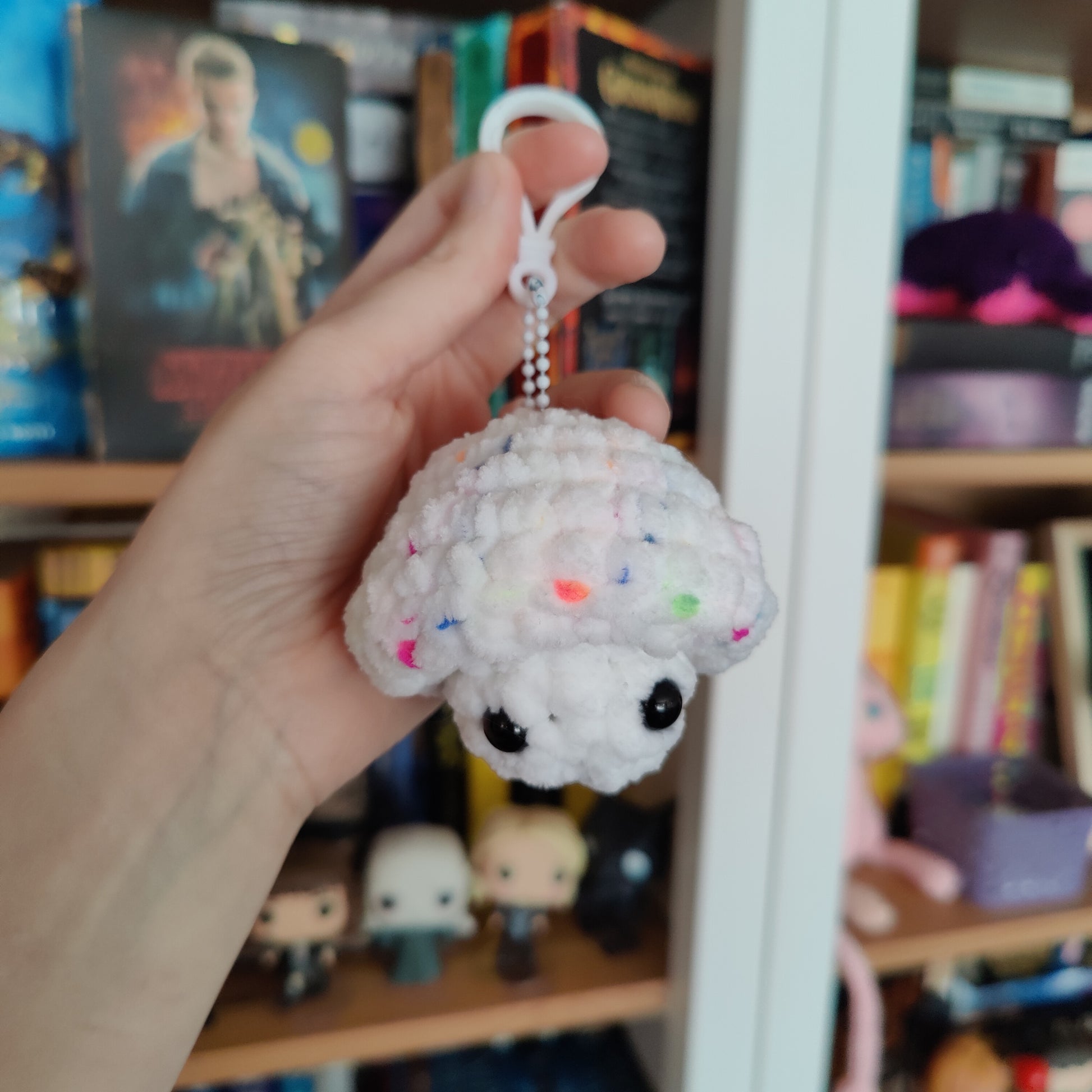 This super cute Mushroom Pop Keychain is perfect to add to your keys or bag. Also it pops! Making this a super fun fidget toy. Made from super soft chenille yarn.