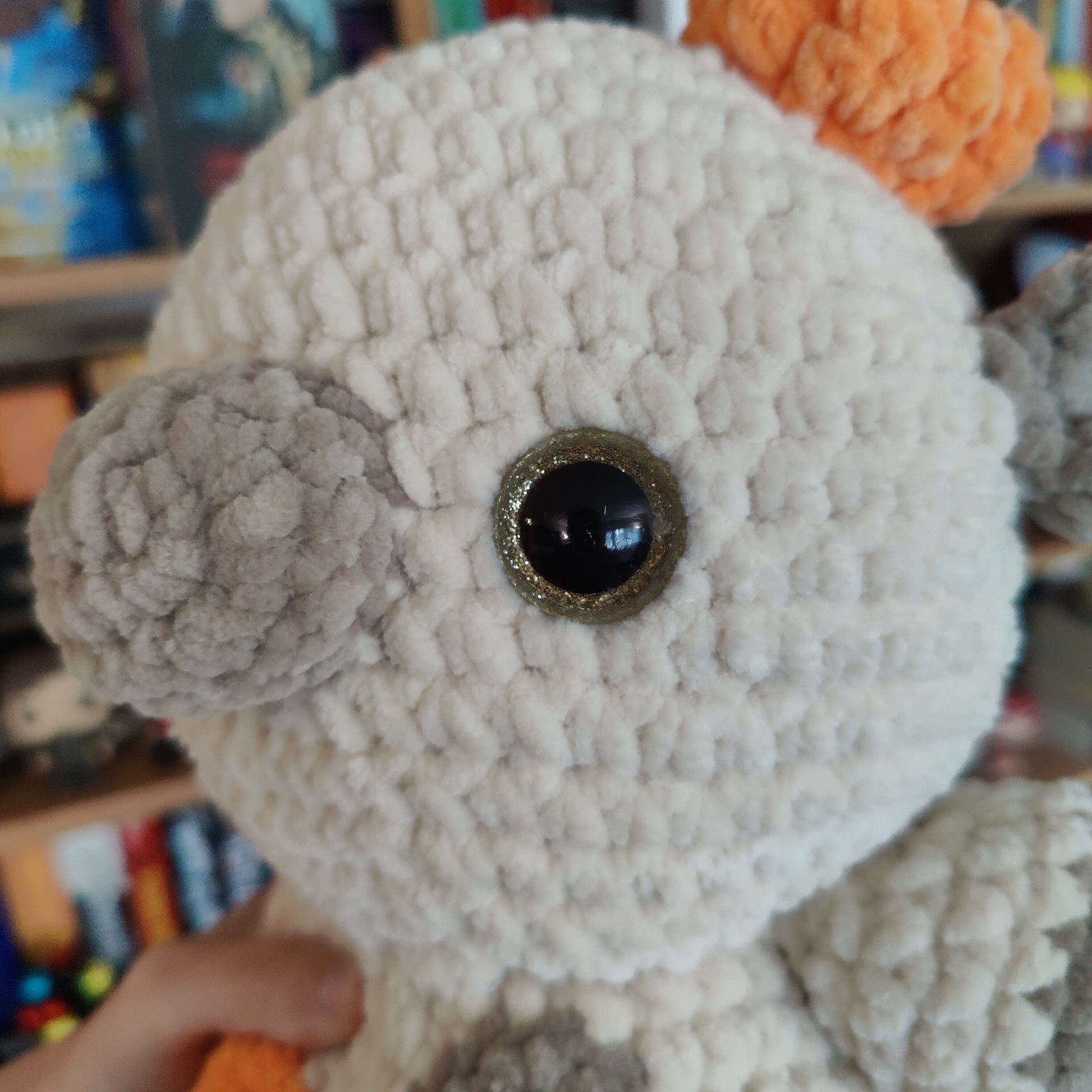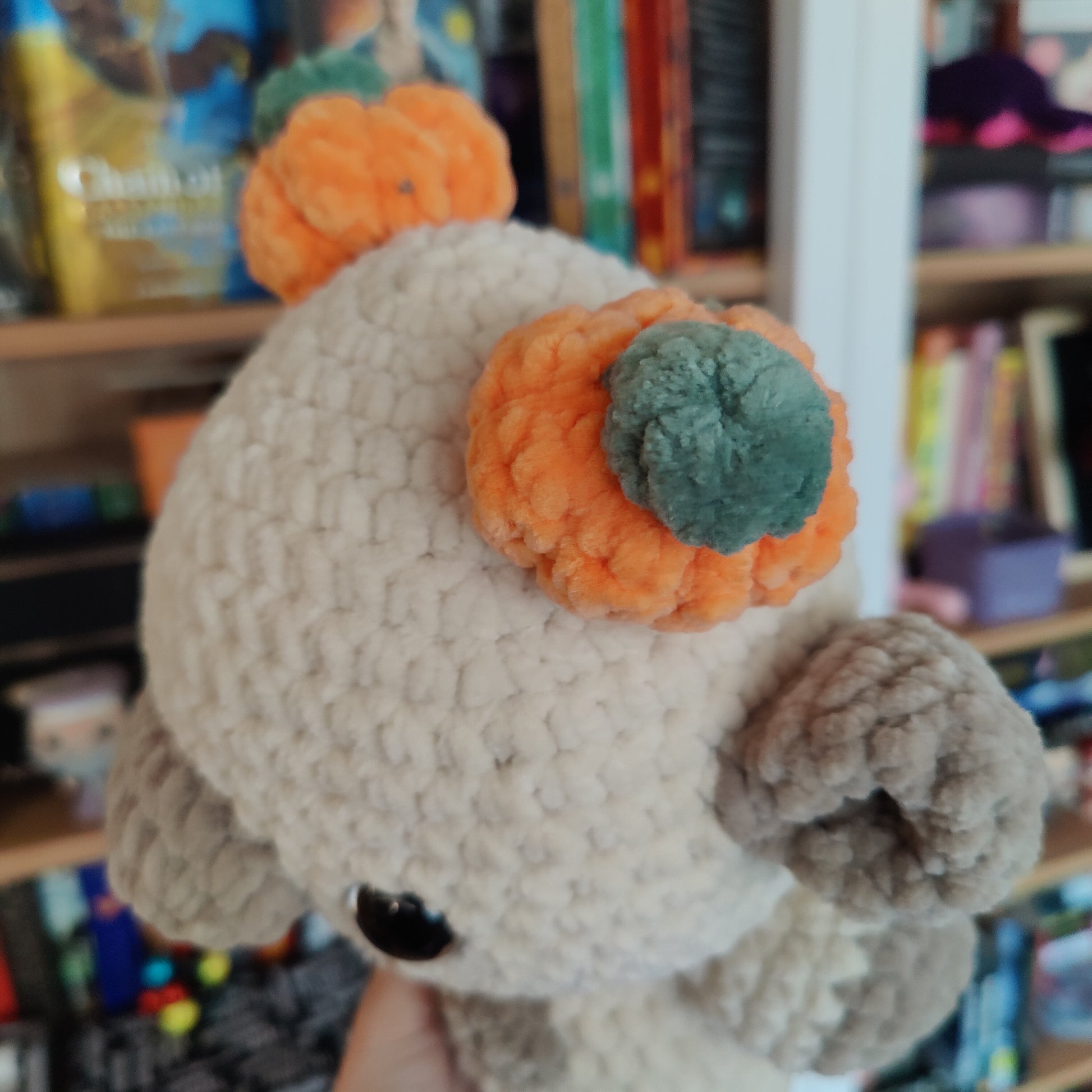 Perfect for the fall season this cow is made from super soft blanket yarn. Pumpkin horns and tan access give off a pumpkin spice latte vibes.