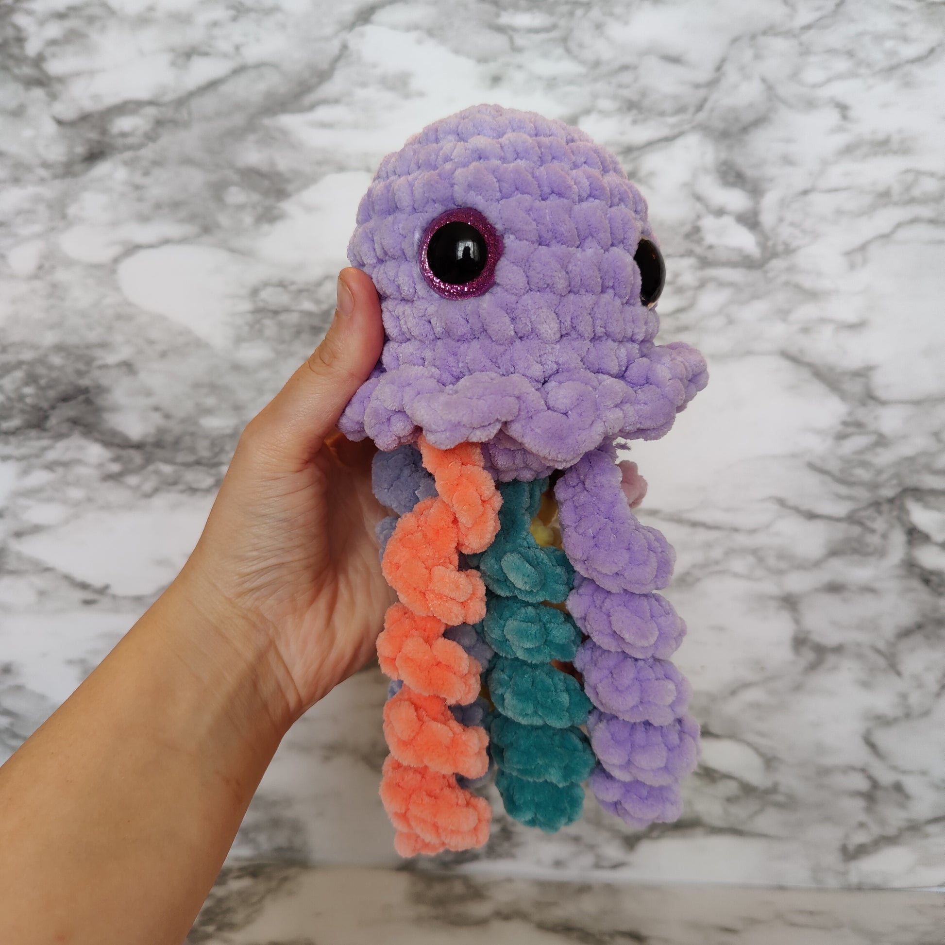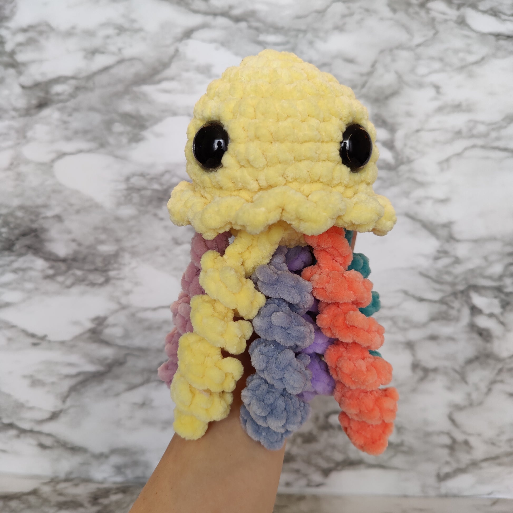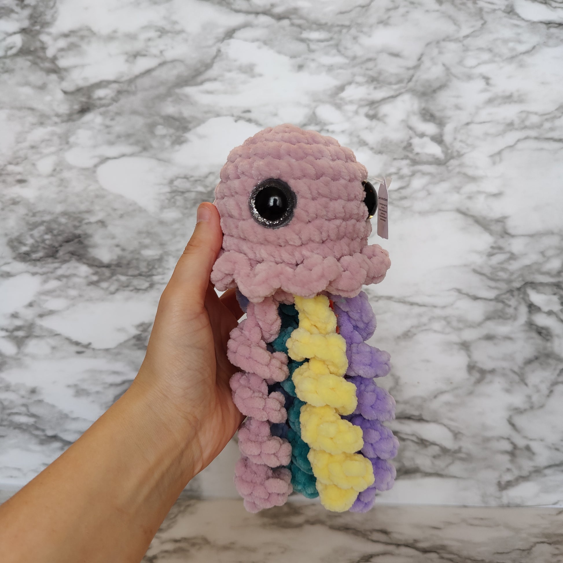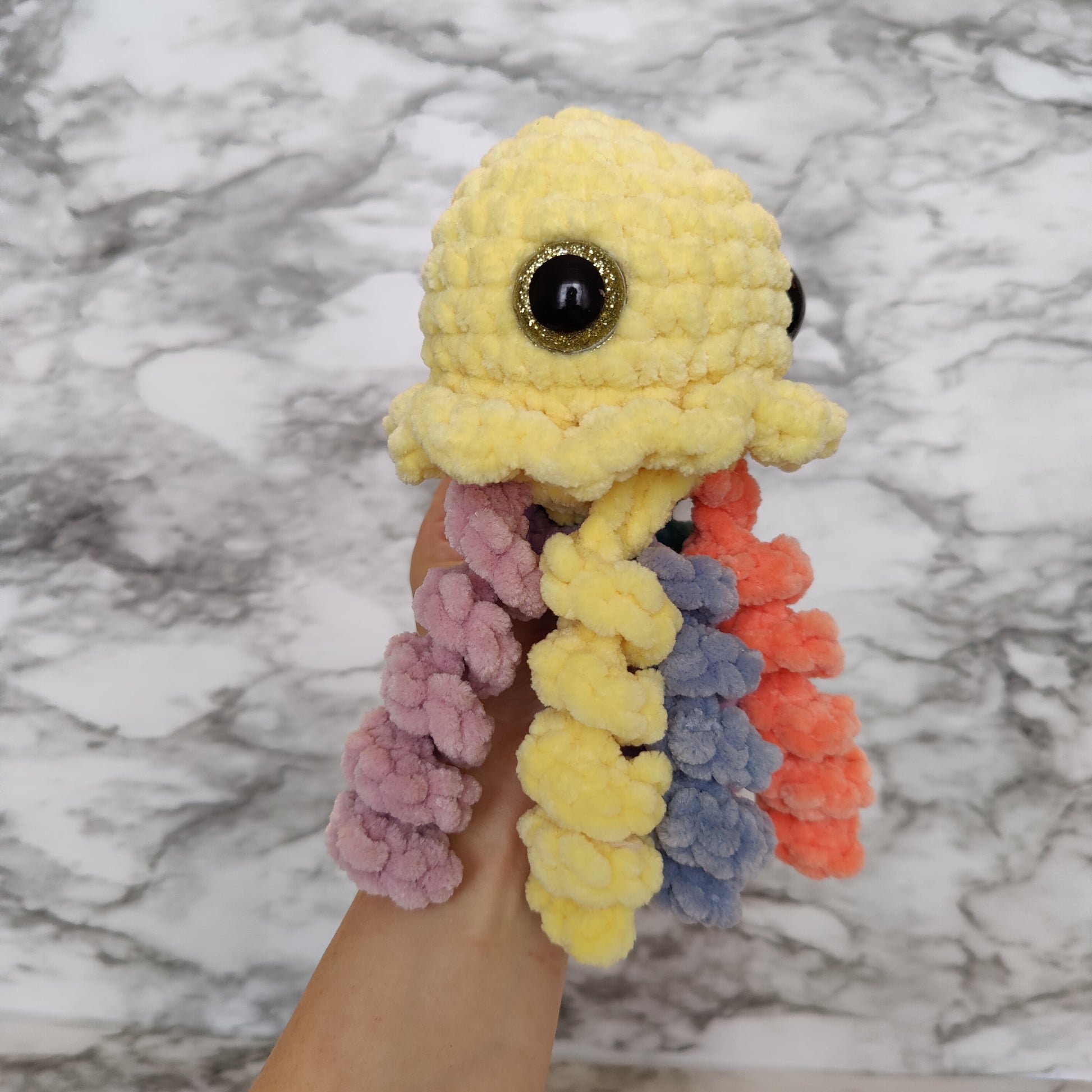 Adorable crochet jellyfish plushie. Features rainbow tentacles and a main color of your choice. Made from super soft chenille yarn.