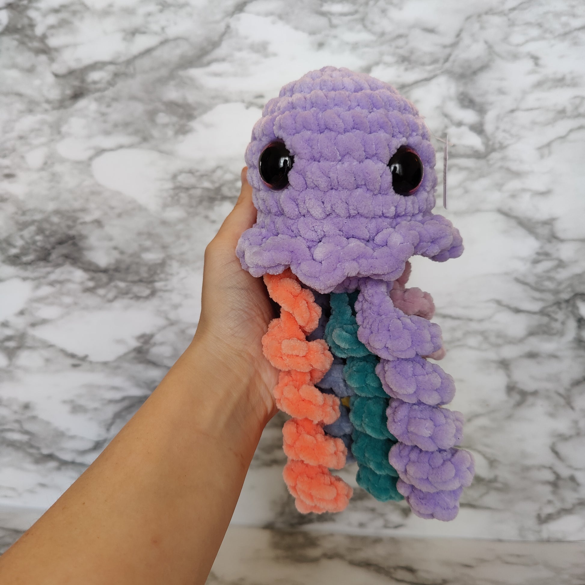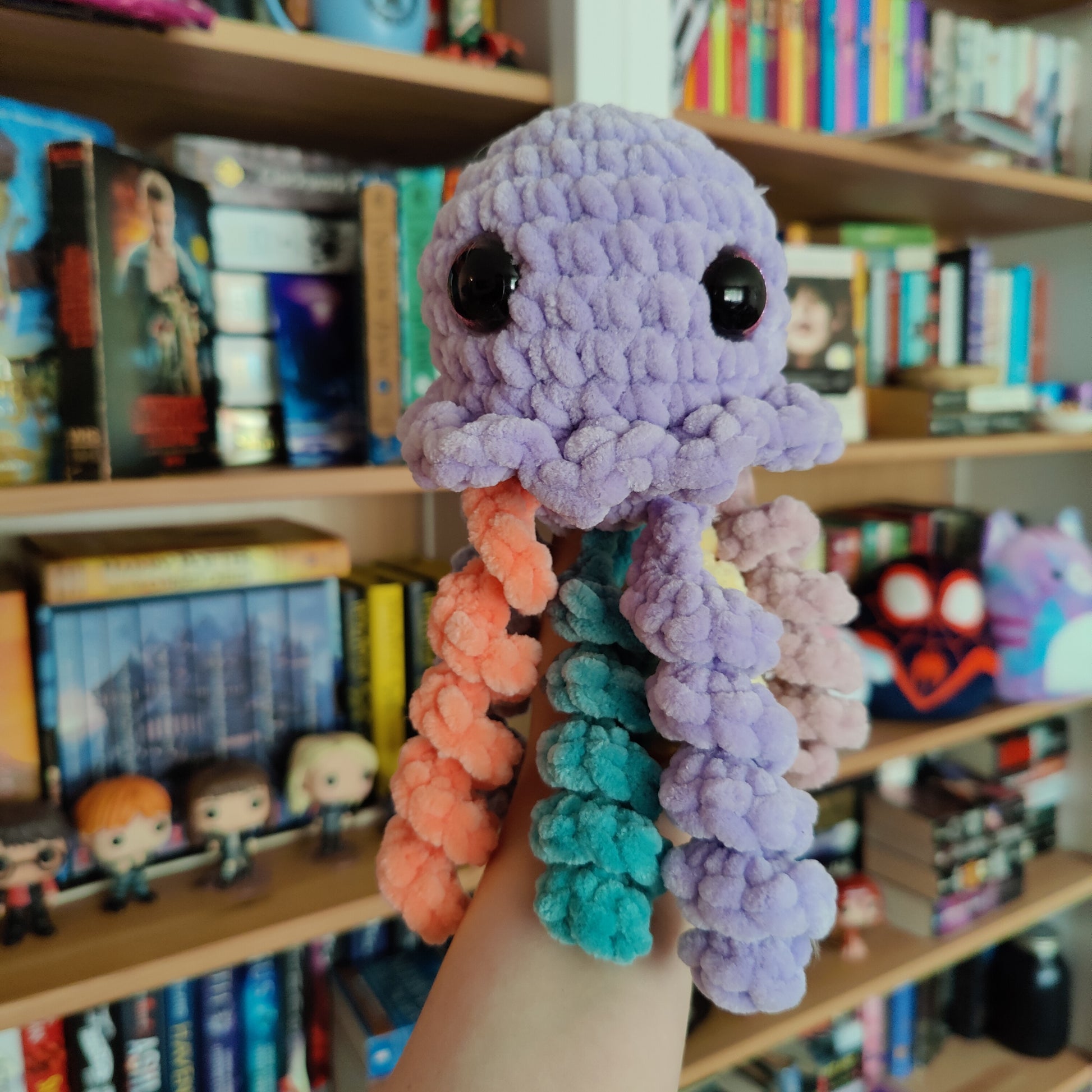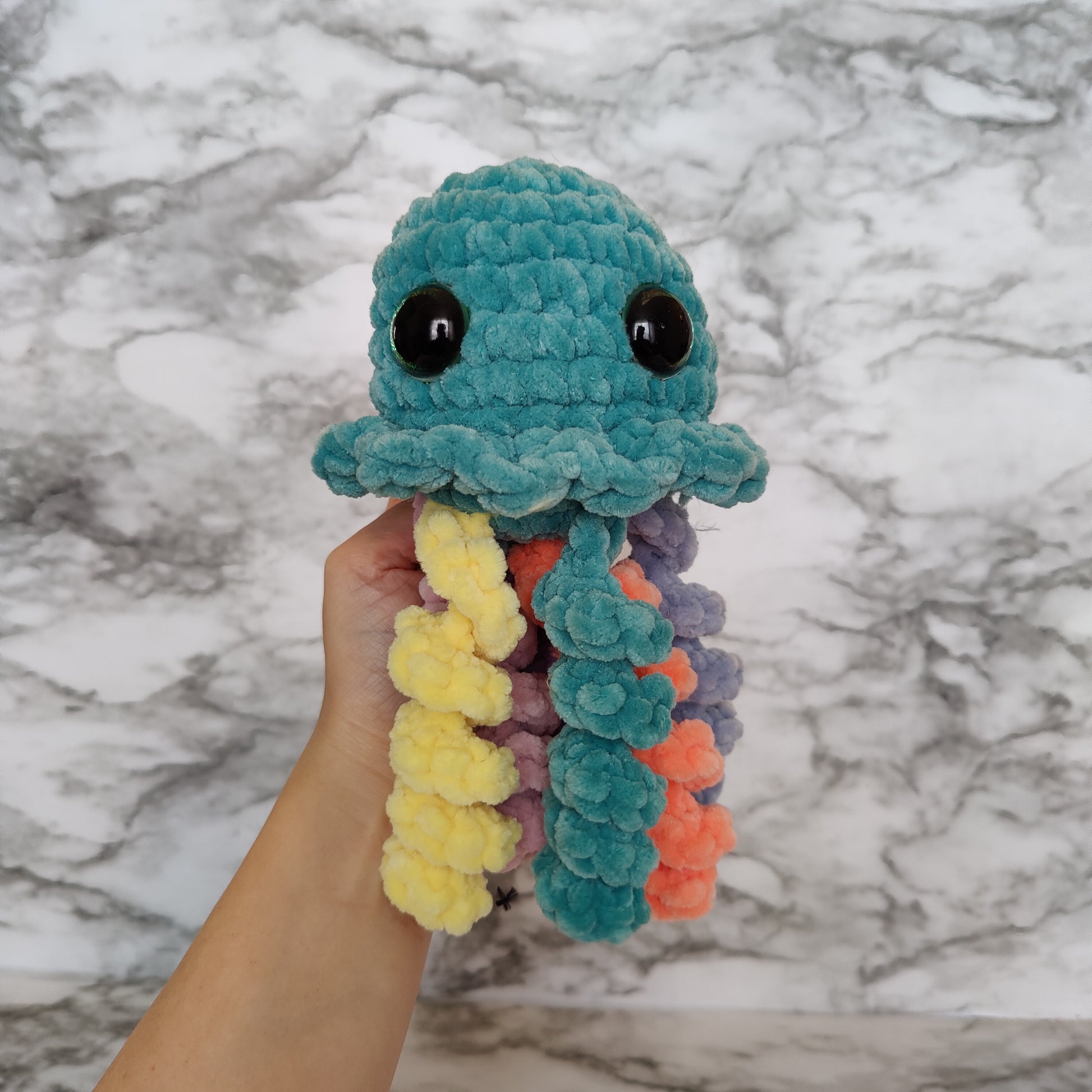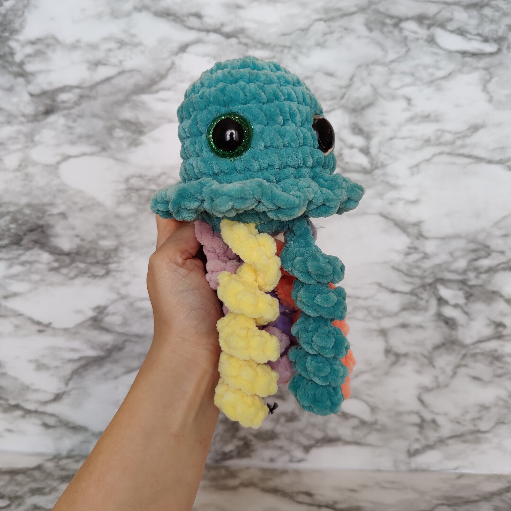 Adorable crochet jellyfish plushie. Features rainbow tentacles and a main color of your choice. Made from super soft chenille yarn.