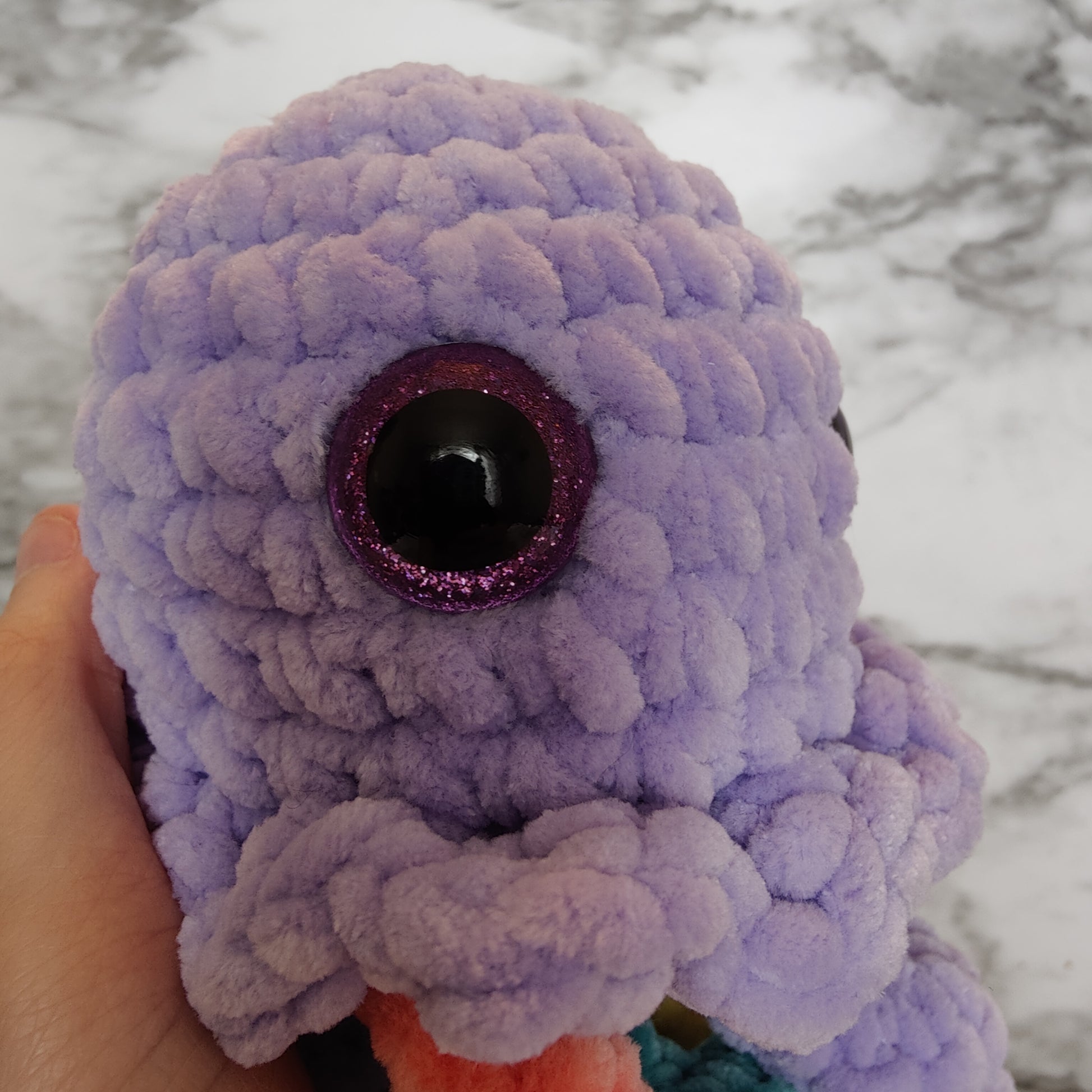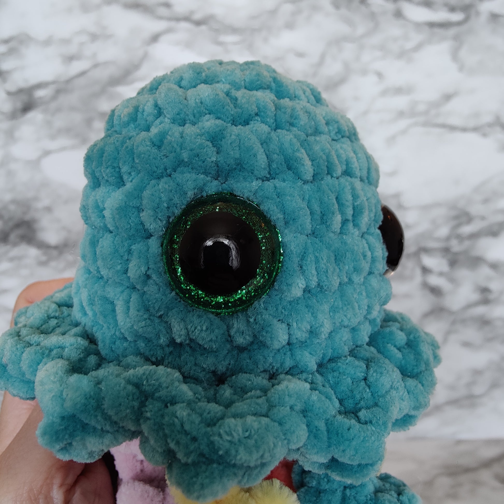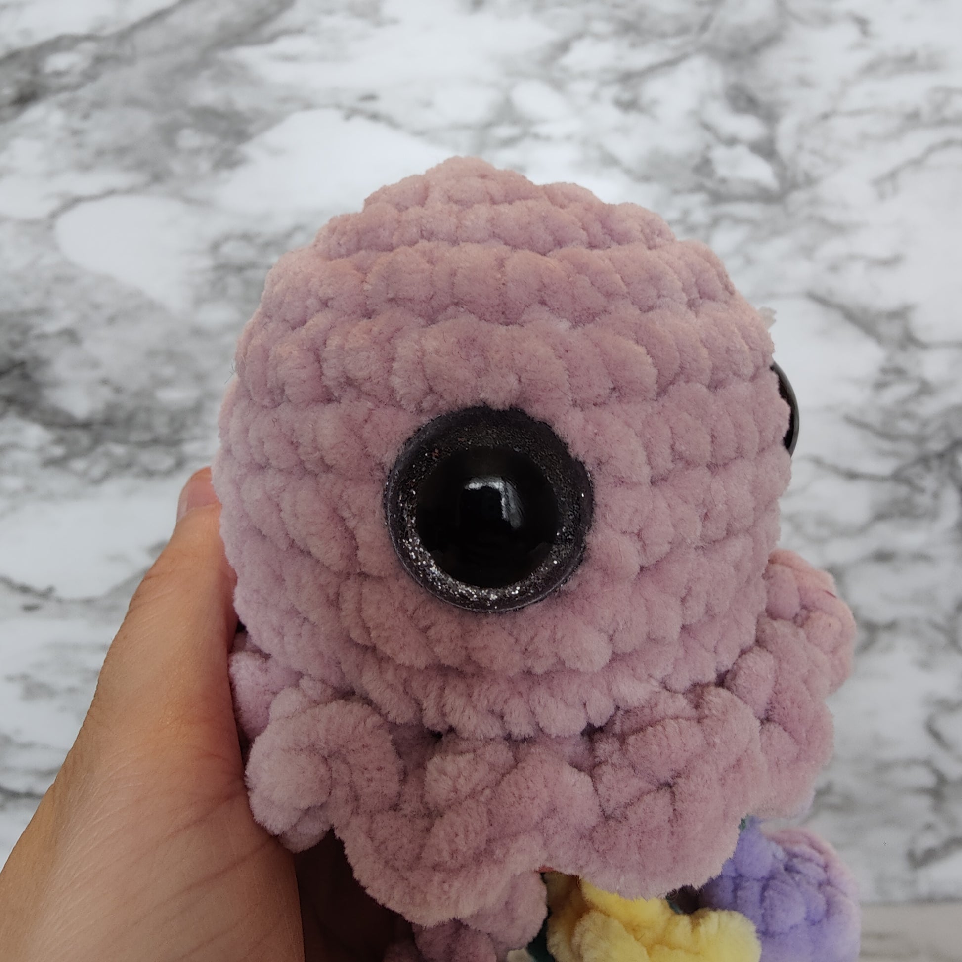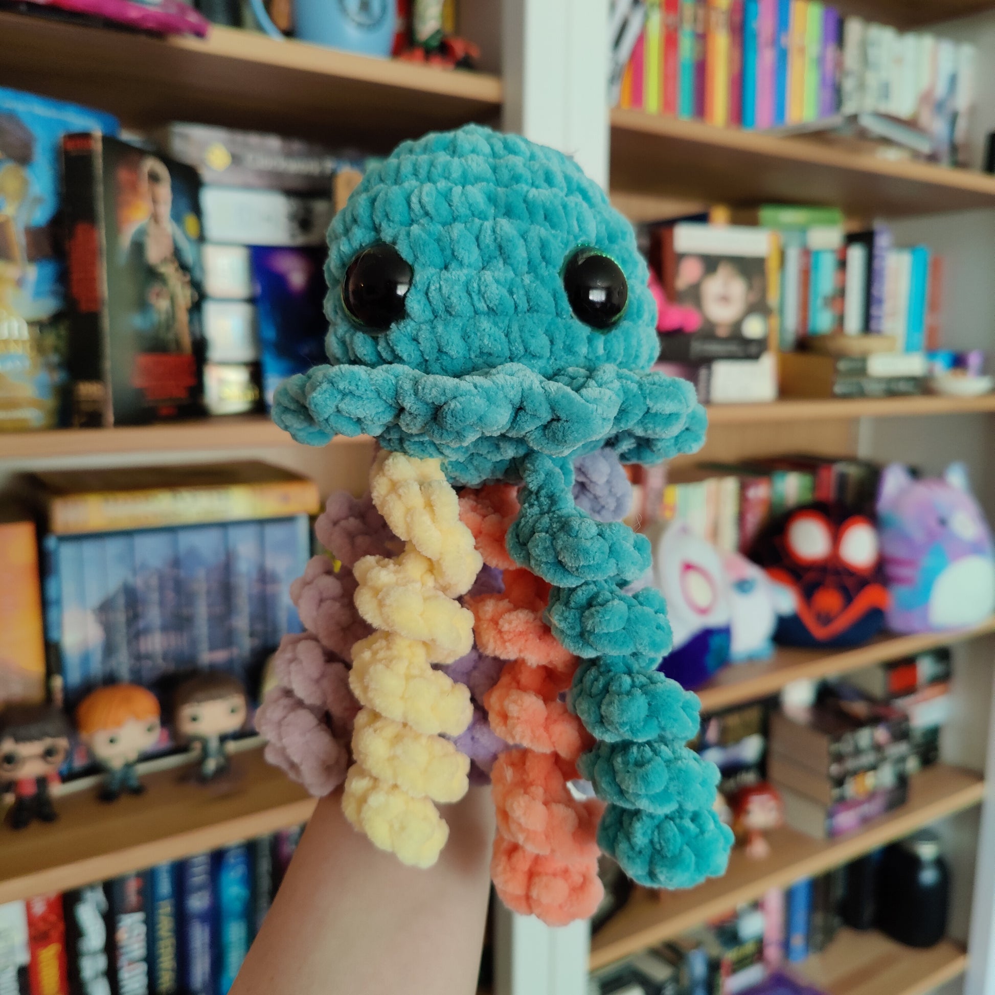 Adorable crochet jellyfish plushie. Features rainbow tentacles and a main color of your choice. Made from super soft chenille yarn.