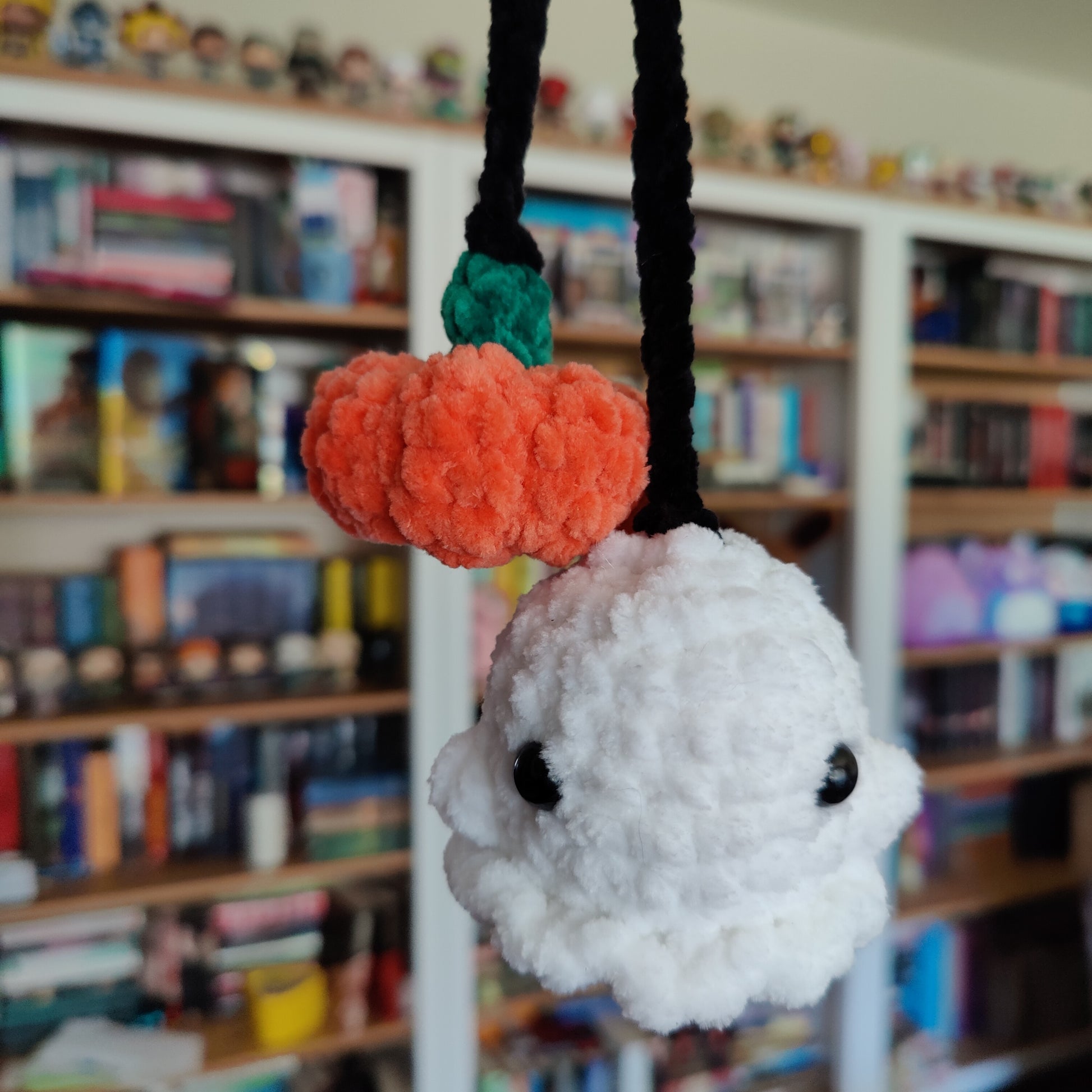 This adorable pumpkin and ghost car charm is perfect for spooky season. Dress up your cars review mirror with this hanging Halloween plushie set.